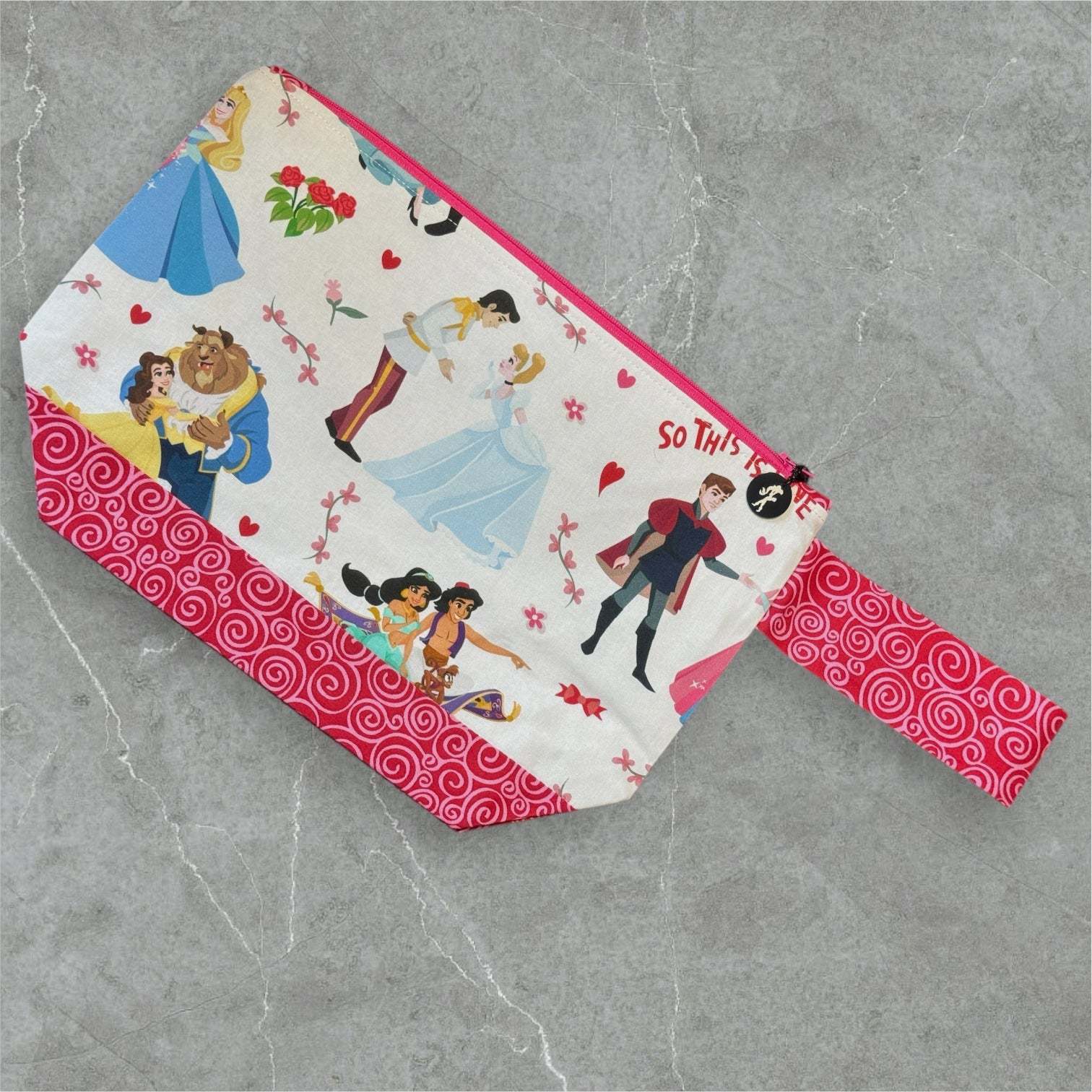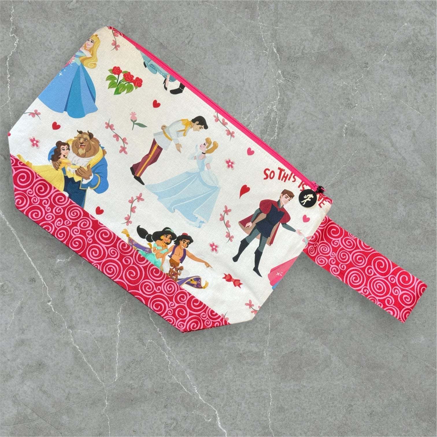 The So This Is Love Project Bag was part of our 2024 Love Story Marker Club, inspired by timeless fairy tale romances. The fabric brings together beloved couples in a soft, whimsical design that feels like a celebration of love and happily ever-afters.