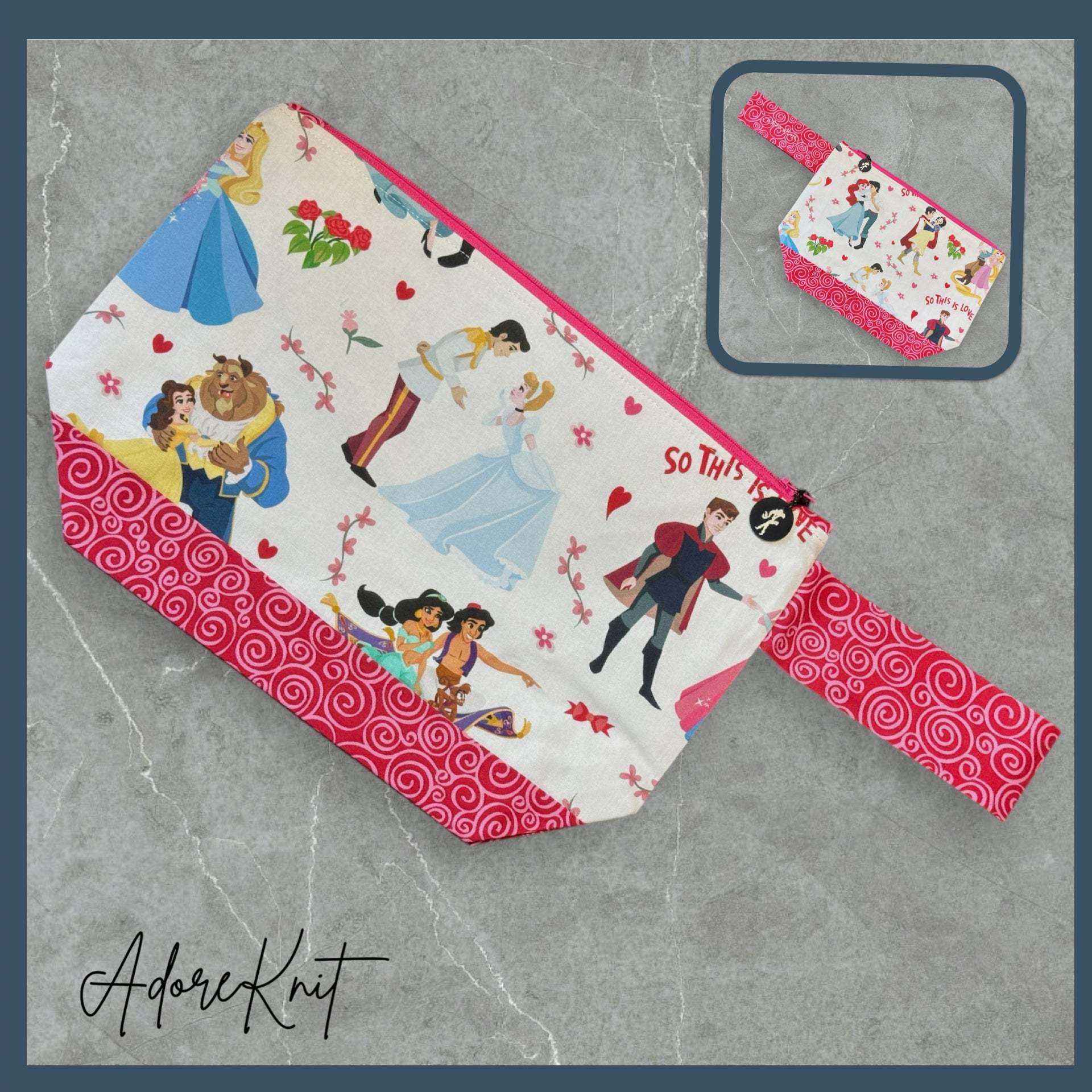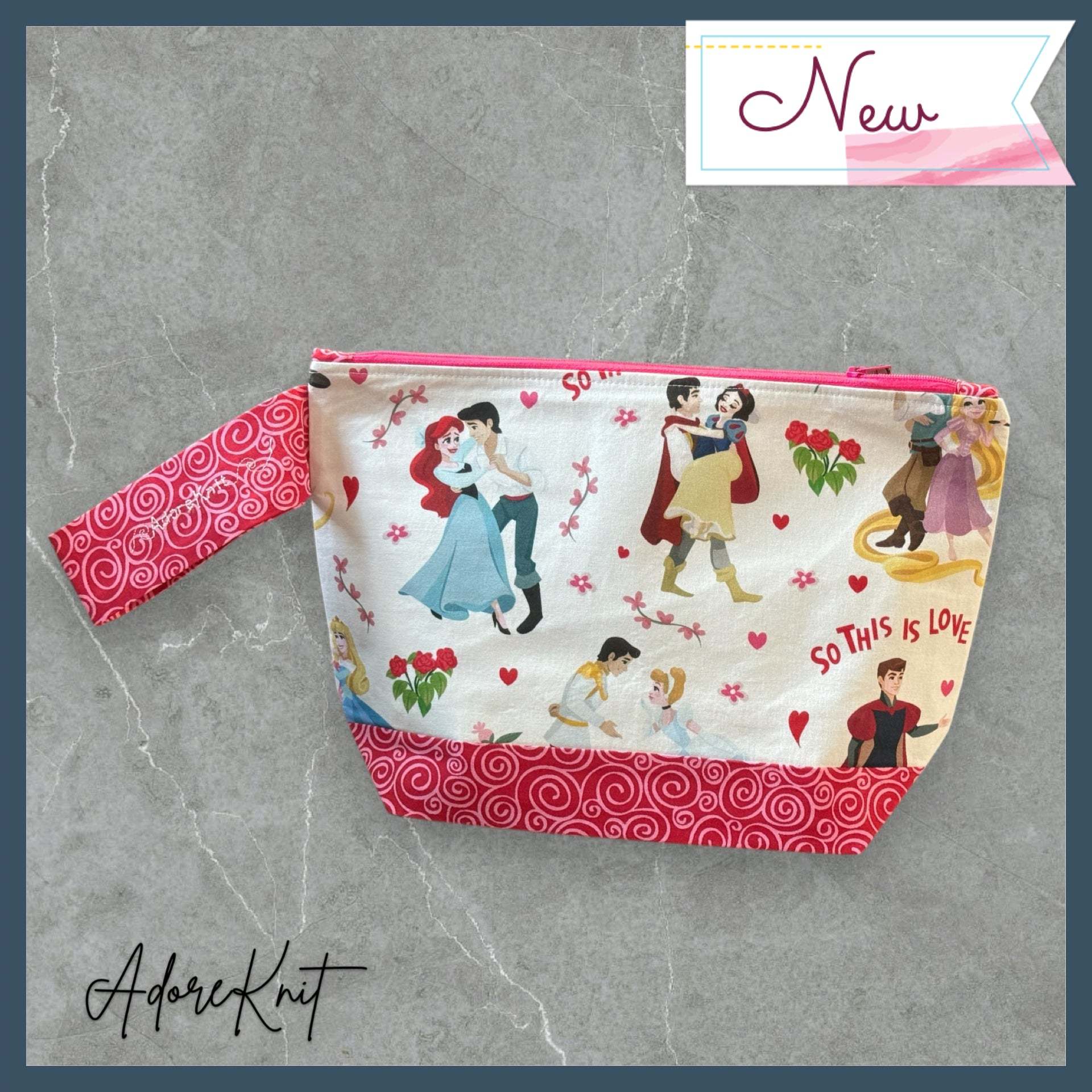 The bag features a contrasting bottom and matching wrist strap, finished with an embroidered AdoreKnit logo. A delicate silhouette of a prince and mermaid on the zipper pull adds a romantic finishing touch. The pull is removable and can double as a progress keeper when needed. Inside, the bag is lined with white fabric scattered with pink princess sketches, a sweet and playful surprise every time you open it.