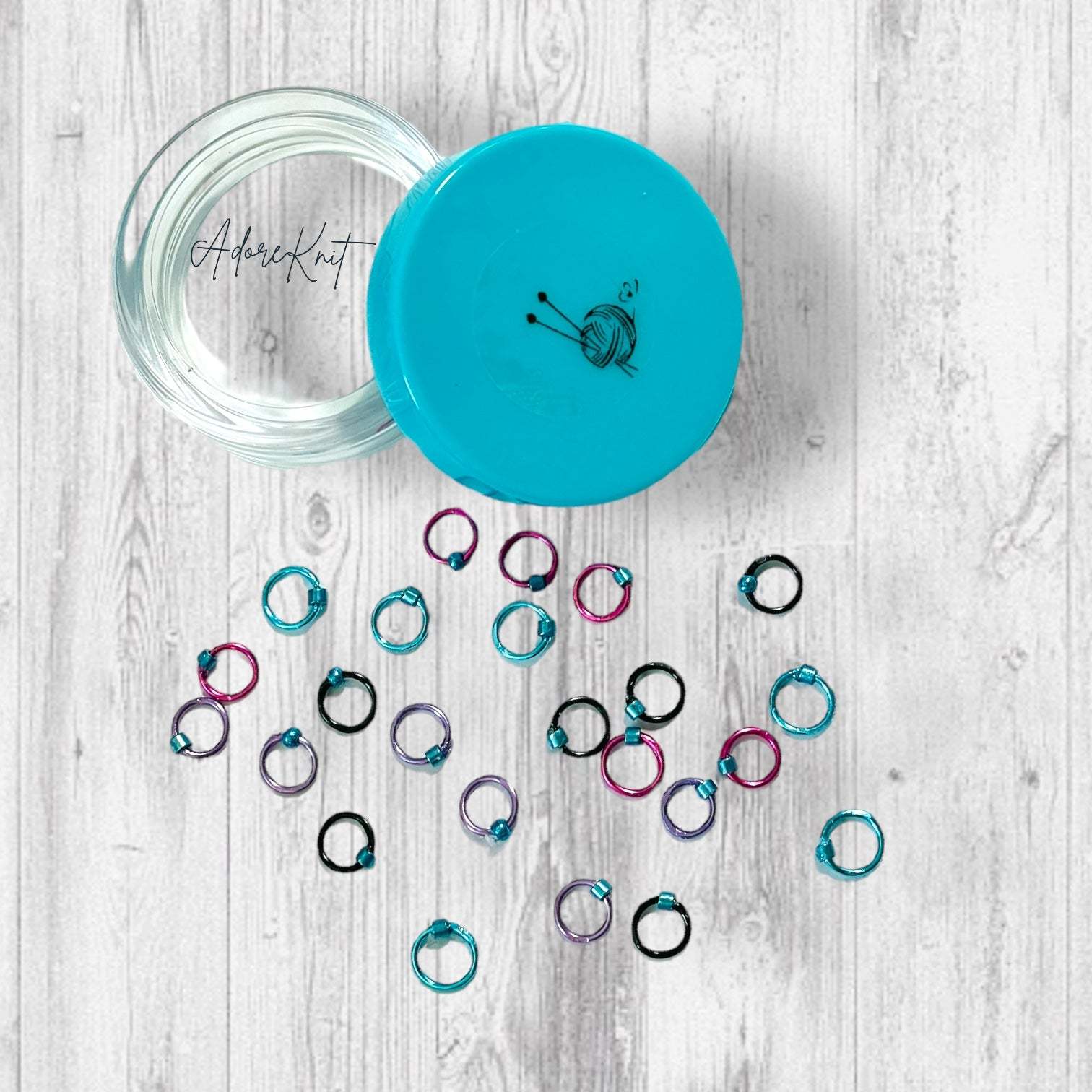 Sock Knitter's Companion Tiny Stitch Markers with Marker Container Aqua with Metallic Blue
