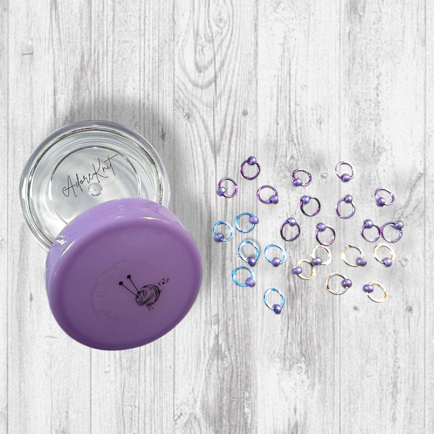 * 24 stitch markers total ā all with shiny lilac beads on pale yellow, light lilac, sky blue, and deep purple rings.