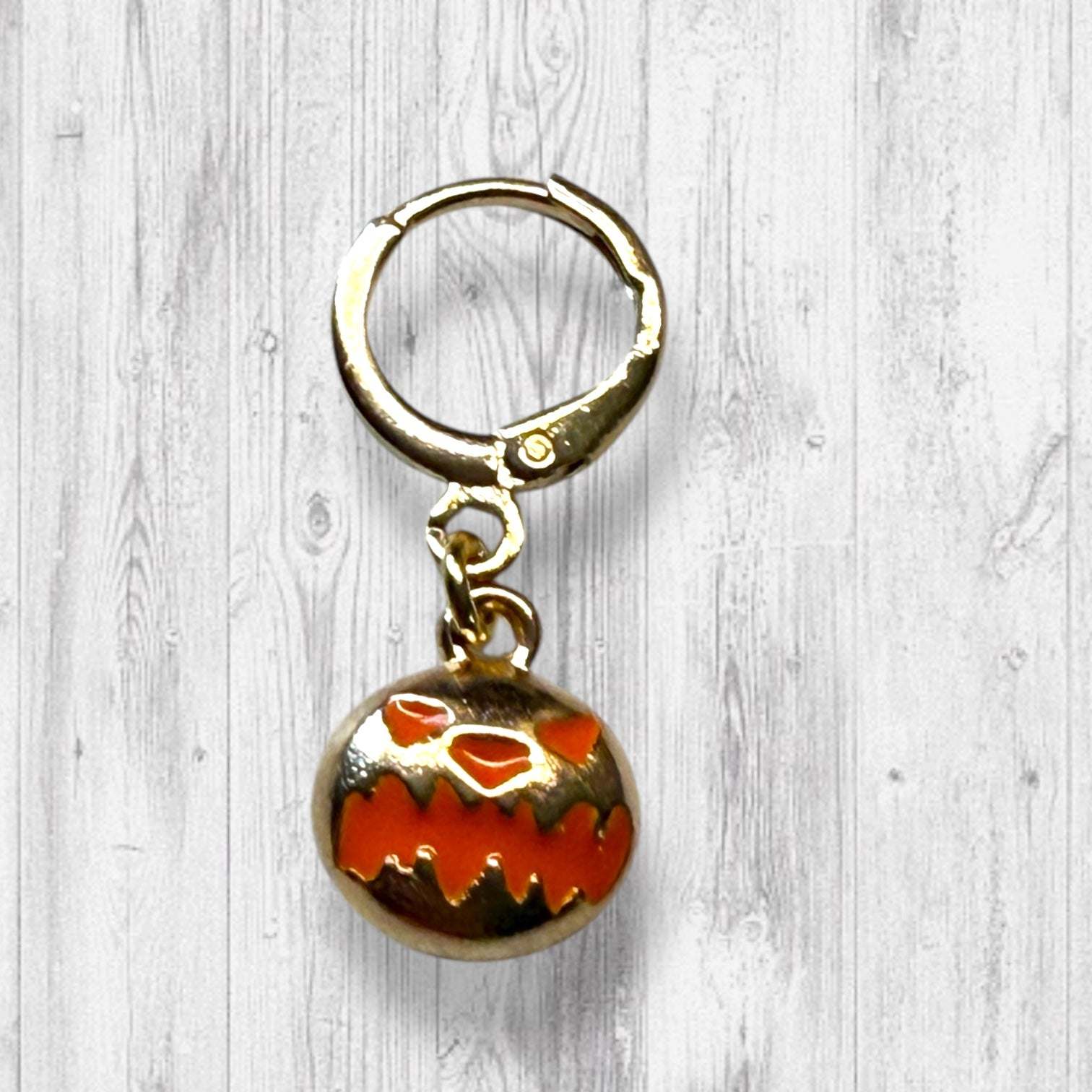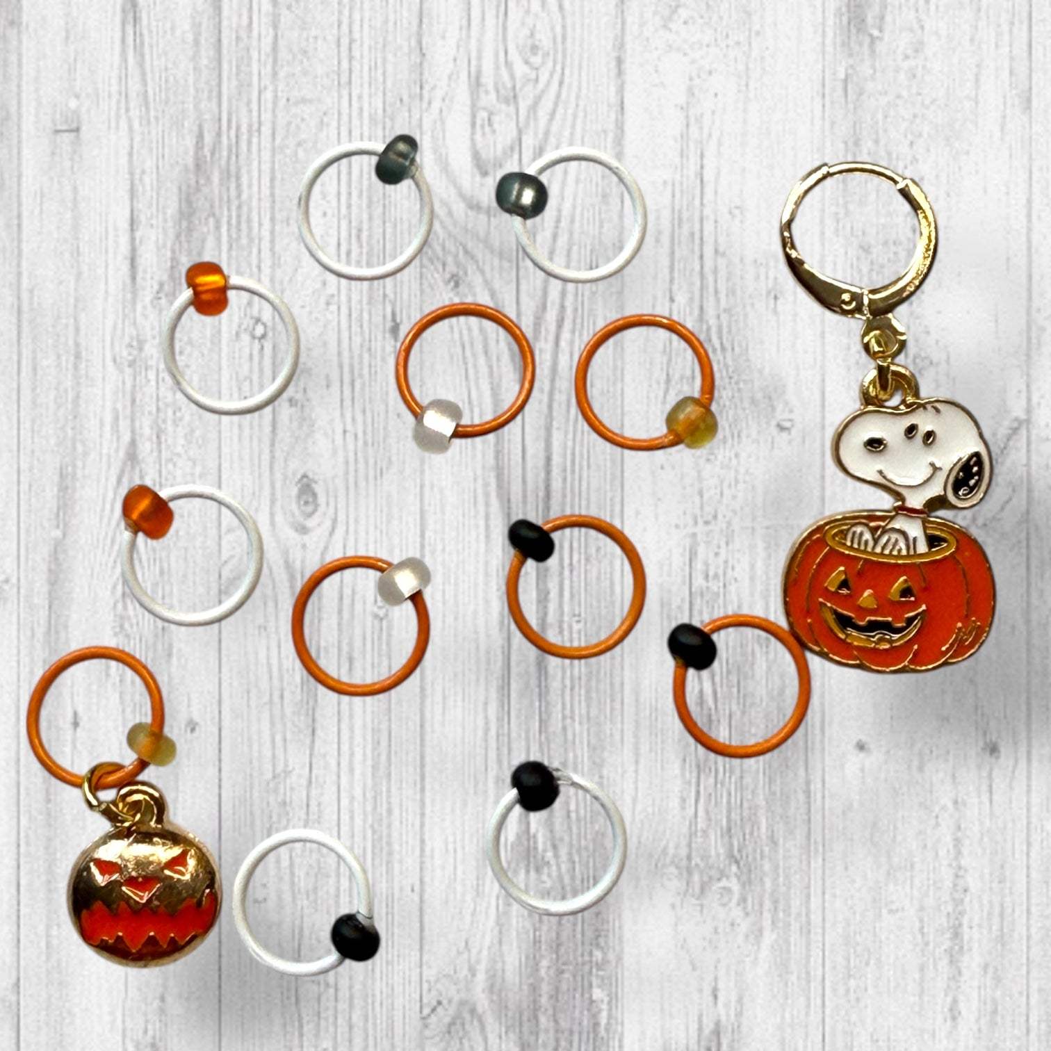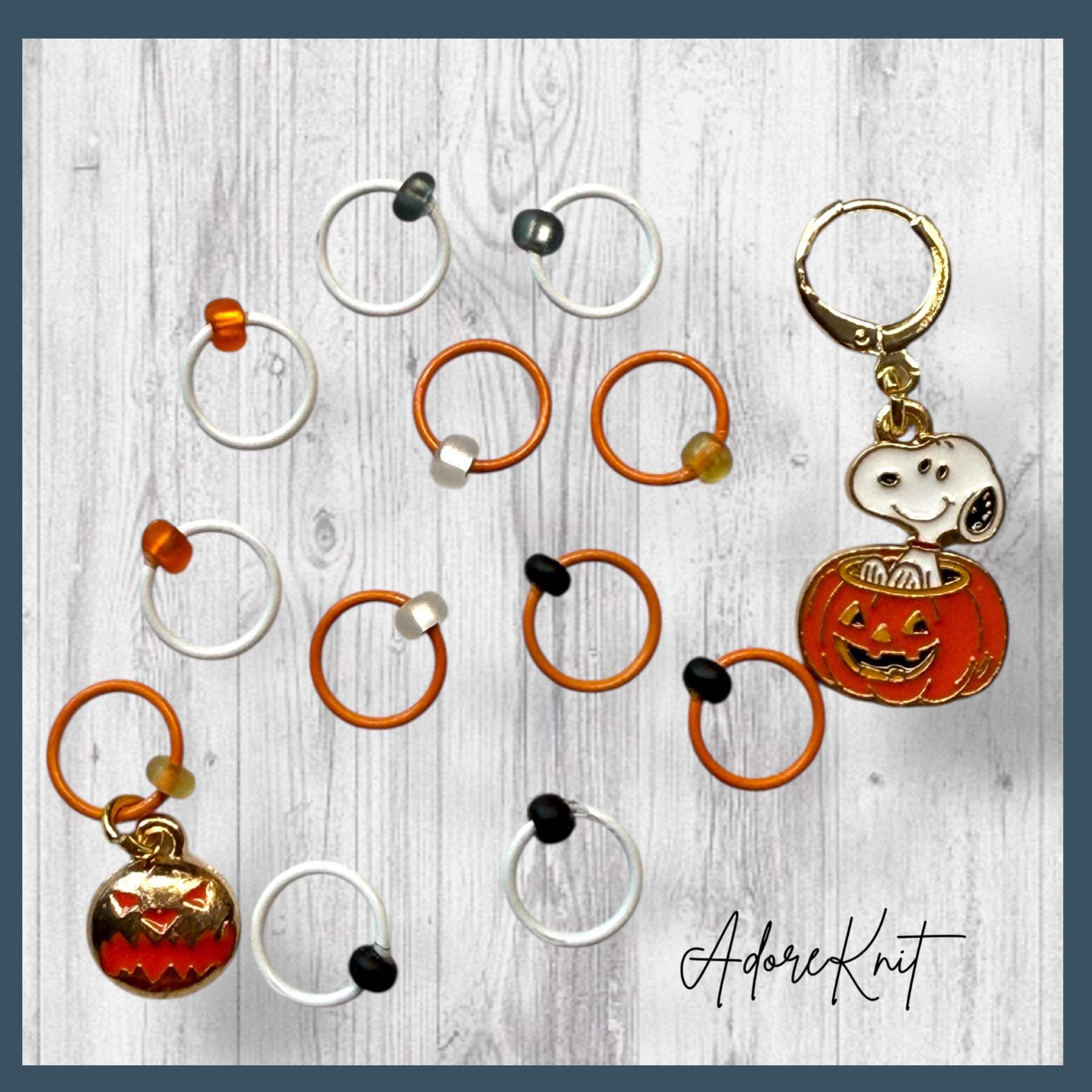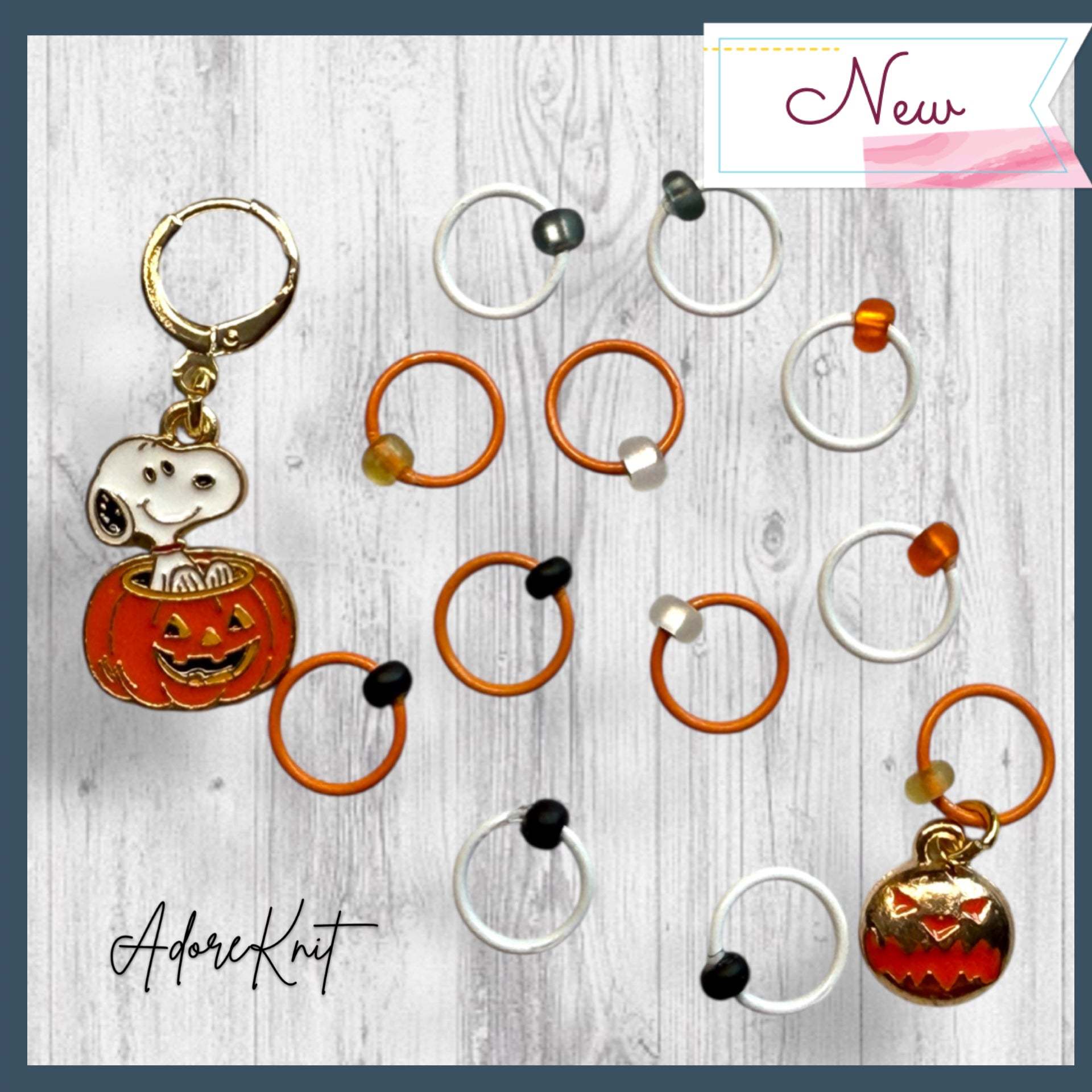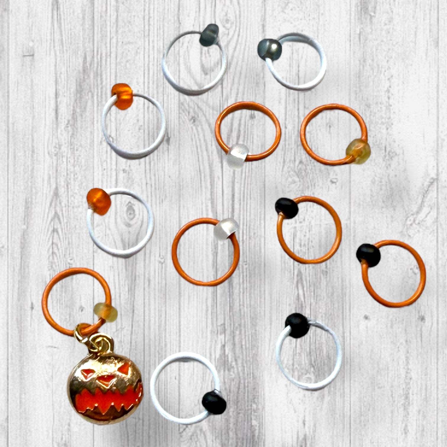 * A Set of 12 Stitch Markers including a small jack-o-lantern beginning of round marker