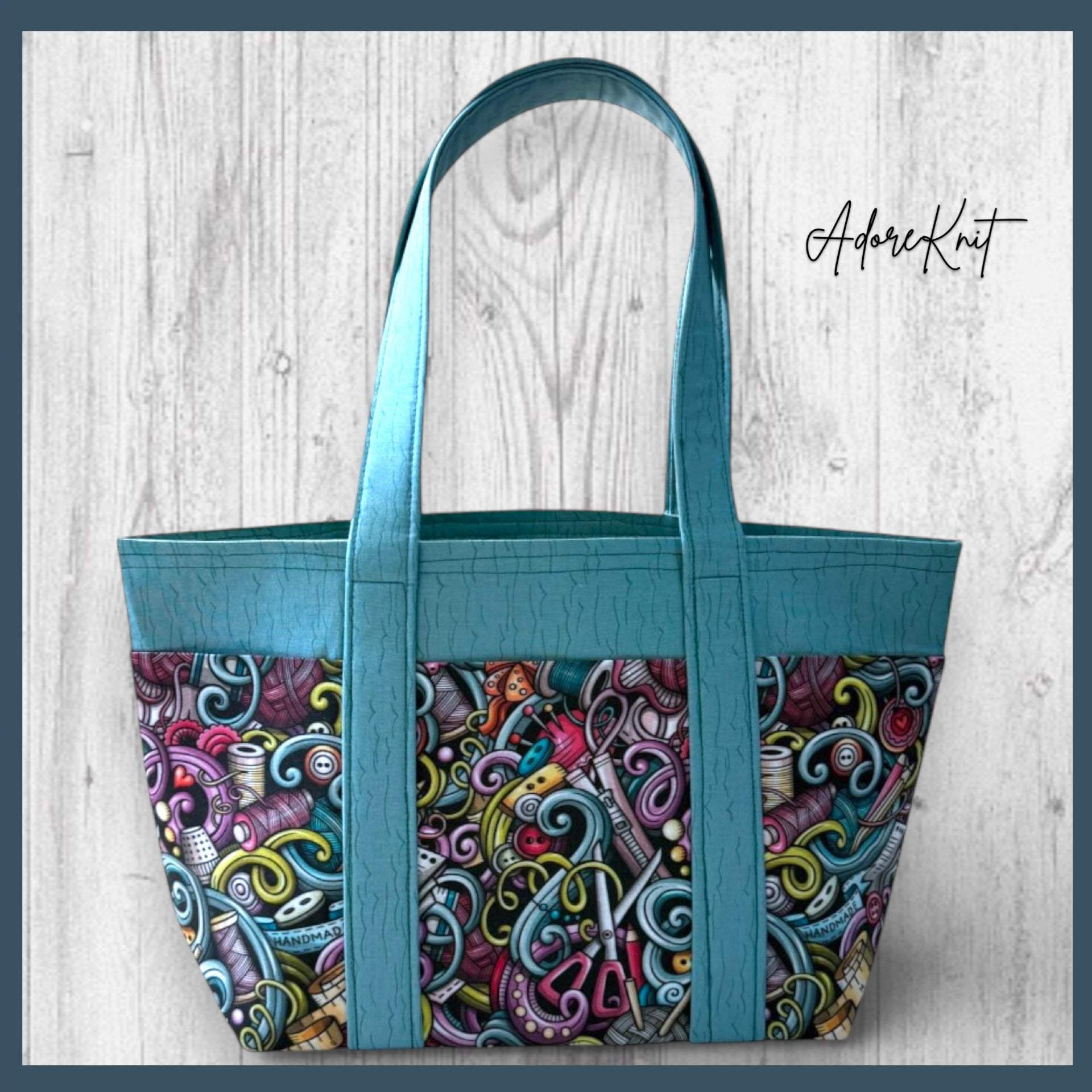 Commuter Tote Bag is our largest sized bag, made to a minimum of 12” high, 16” wide at the top, with a rectangular bottom of 12” by 4”. This bag is an open-mouthed bag, it does not have a zipper. Sturdy straps allow you to carry the bag without losing its shape. The bag will comfortably fit six or even eight skein projects and is ideal for sweaters, larger shawl projects, and even blankets. Or throw all your other project bags in this one.
