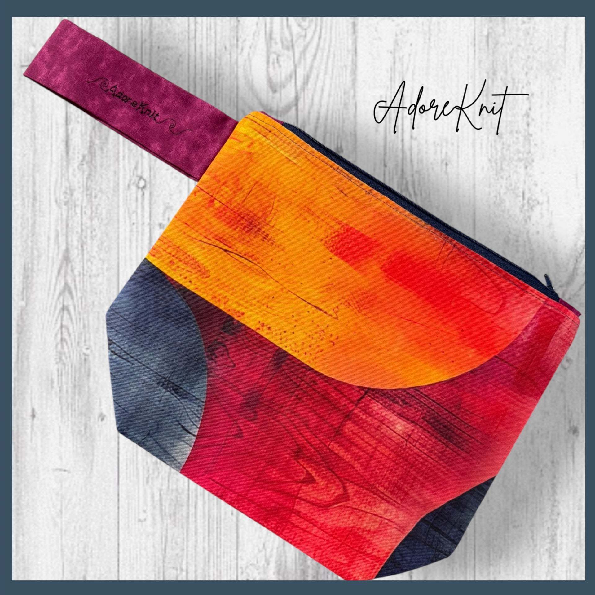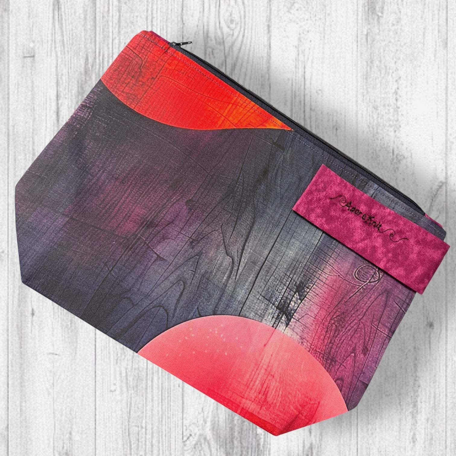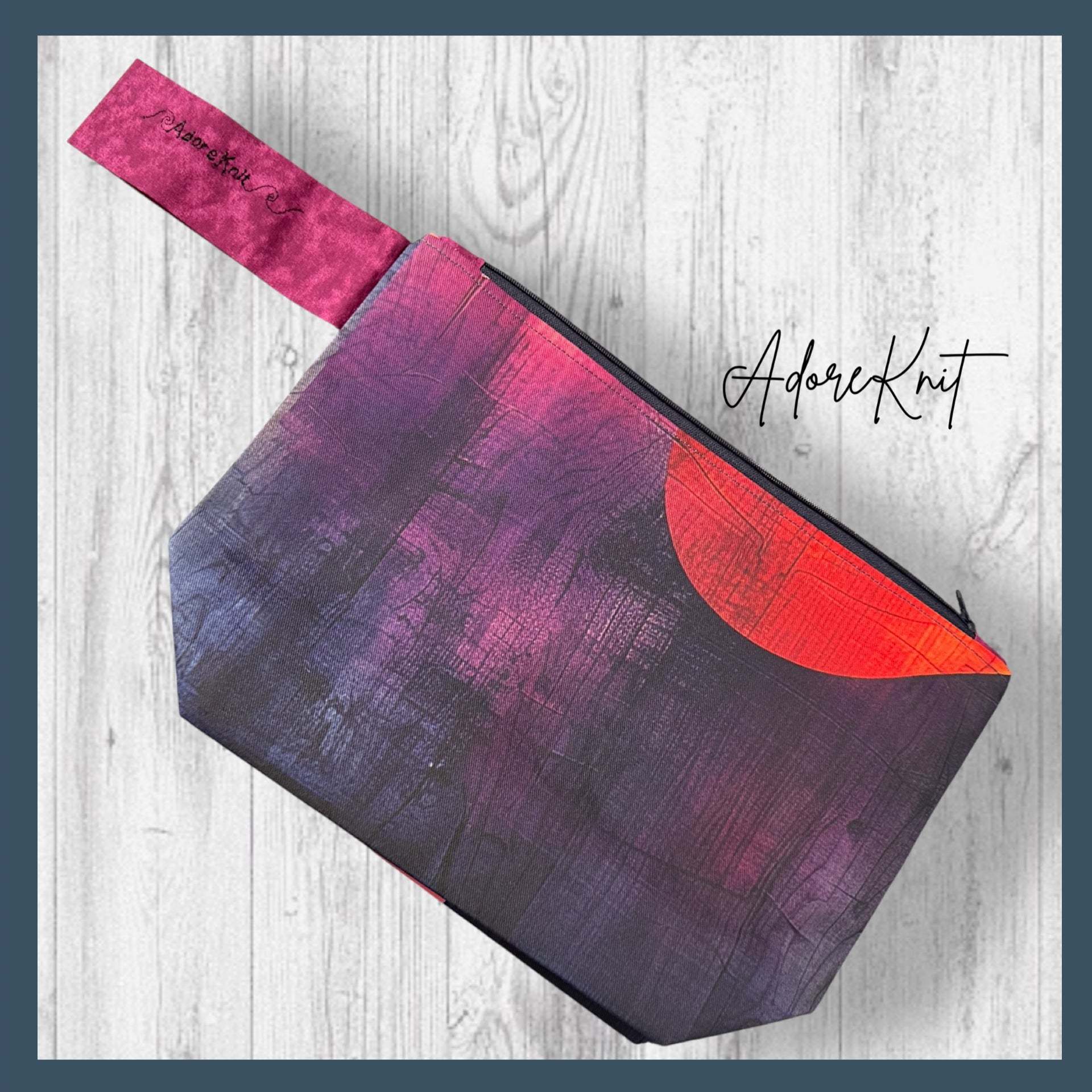 Notions Pouch is made to a minimum of 5” high and 5” wide at the zippered top. The fabrics match those used in the project bags. It is an envelope type pouch. It will comfortably fit darning needle case, measuring tape, stitch marker container and few other essentials.