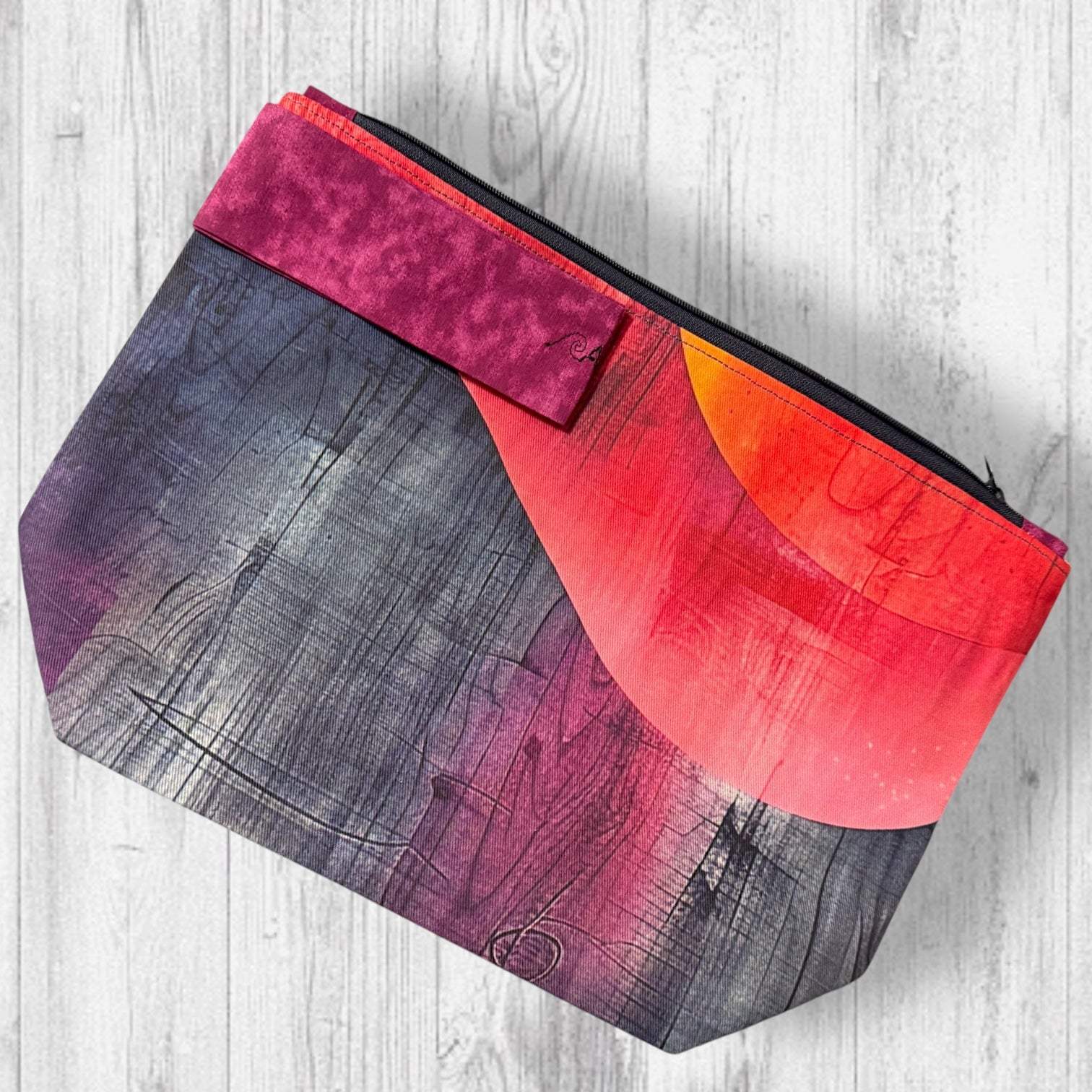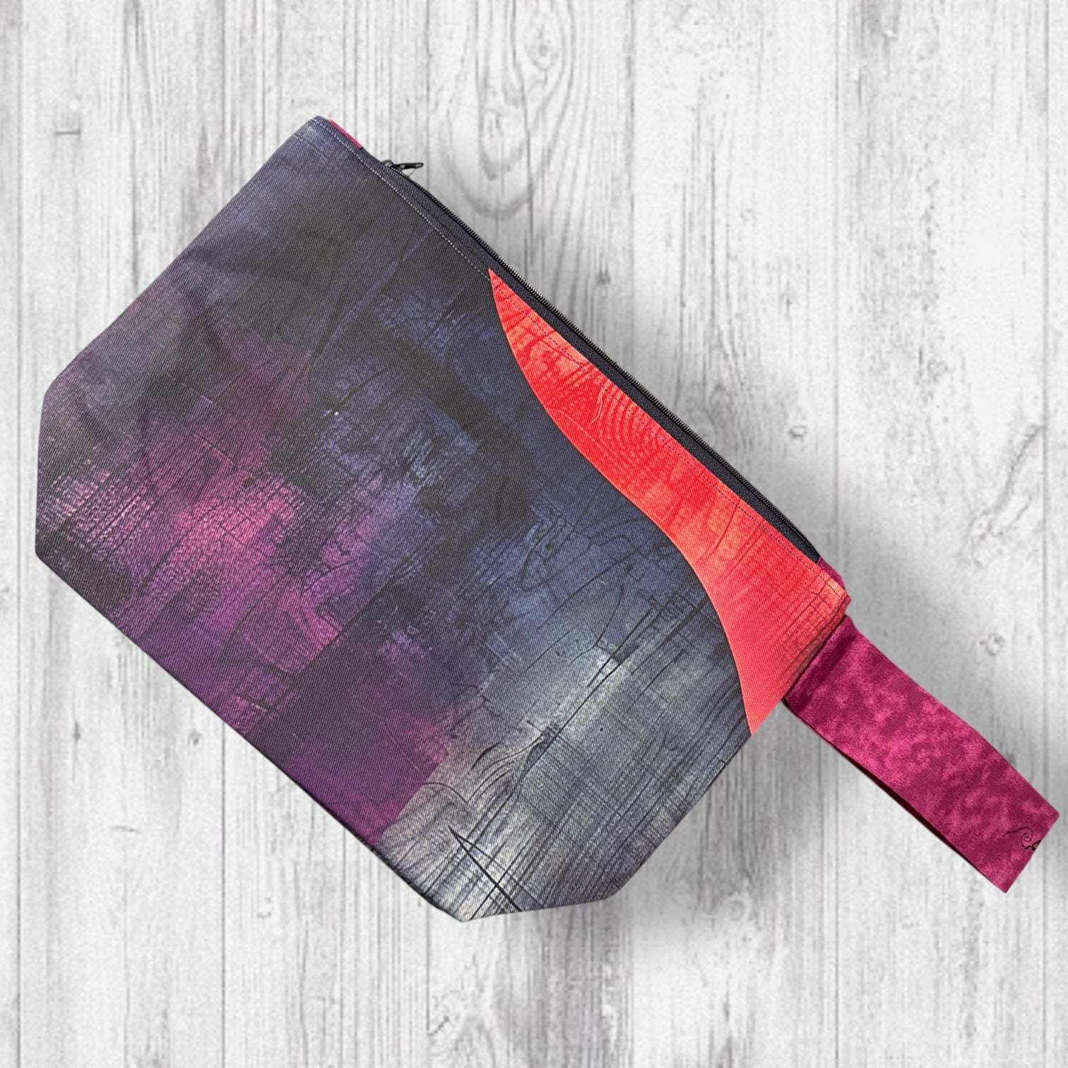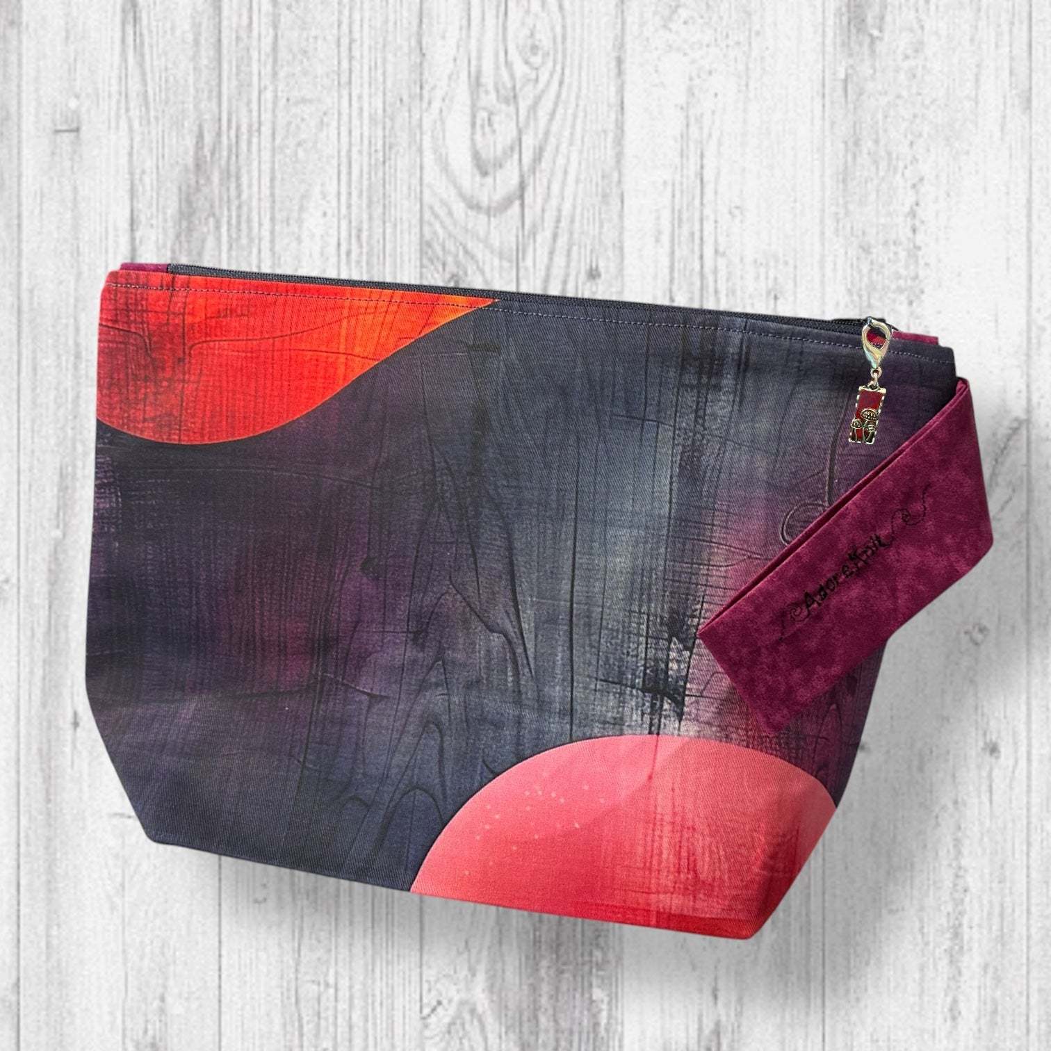 Notions Pouch is made to a minimum of 5” high and 5” wide at the zippered top. The fabrics match those used in the project bags. It is an envelope type pouch. It will comfortably fit darning needle case, measuring tape, stitch marker container and few other essentials.