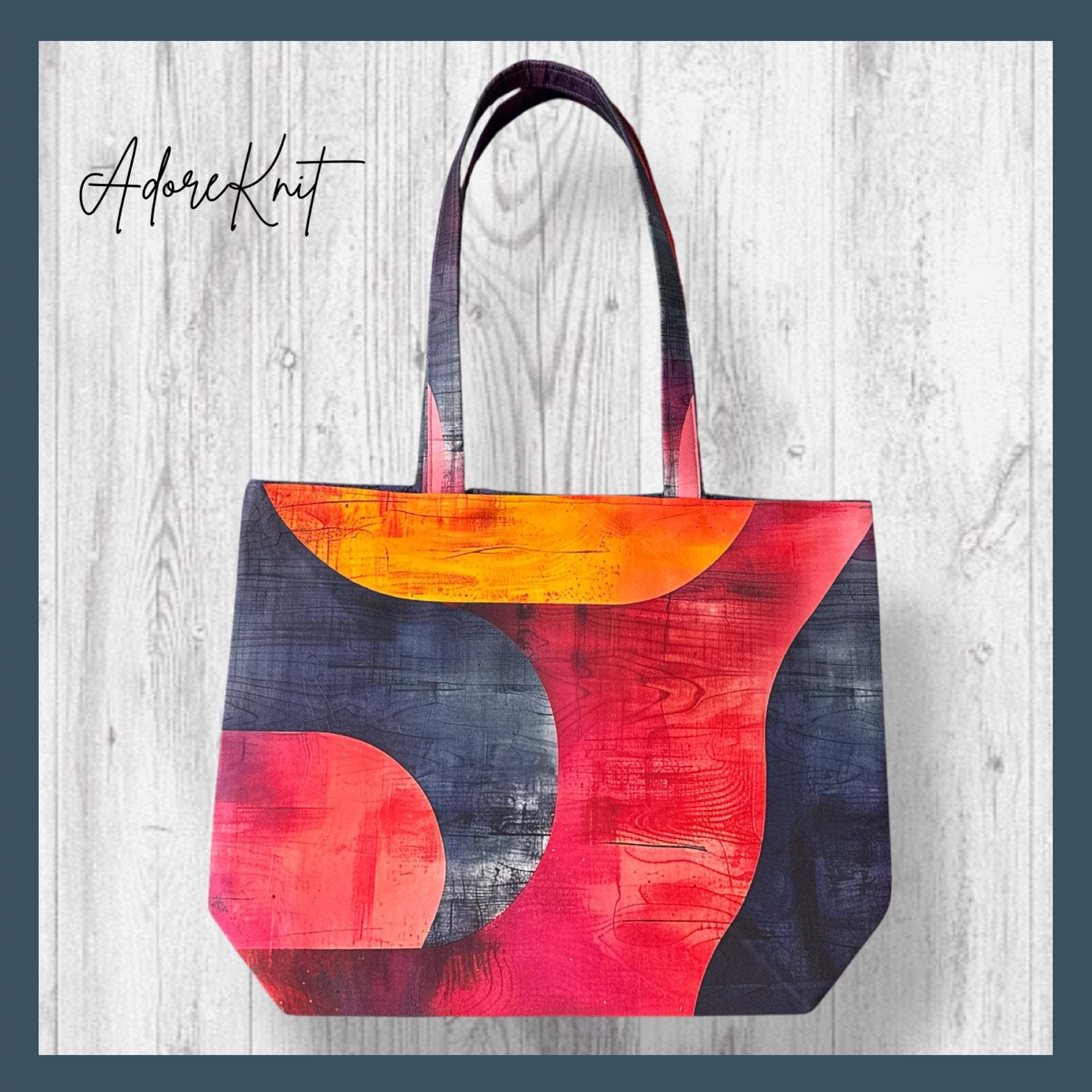 Commuter Tote Bag is our largest sized bag, made to a minimum of 12” high, 16” wide at the top, with a rectangular bottom of 12” by 4”. This bag is an open-mouthed bag, it does not have a zipper. Sturdy straps allow you to carry the bag without losing its shape. The bag will comfortably fit six or even eight skein projects and is ideal for sweaters, larger shawl projects, and even blankets. Or throw all your other project bags in this one.