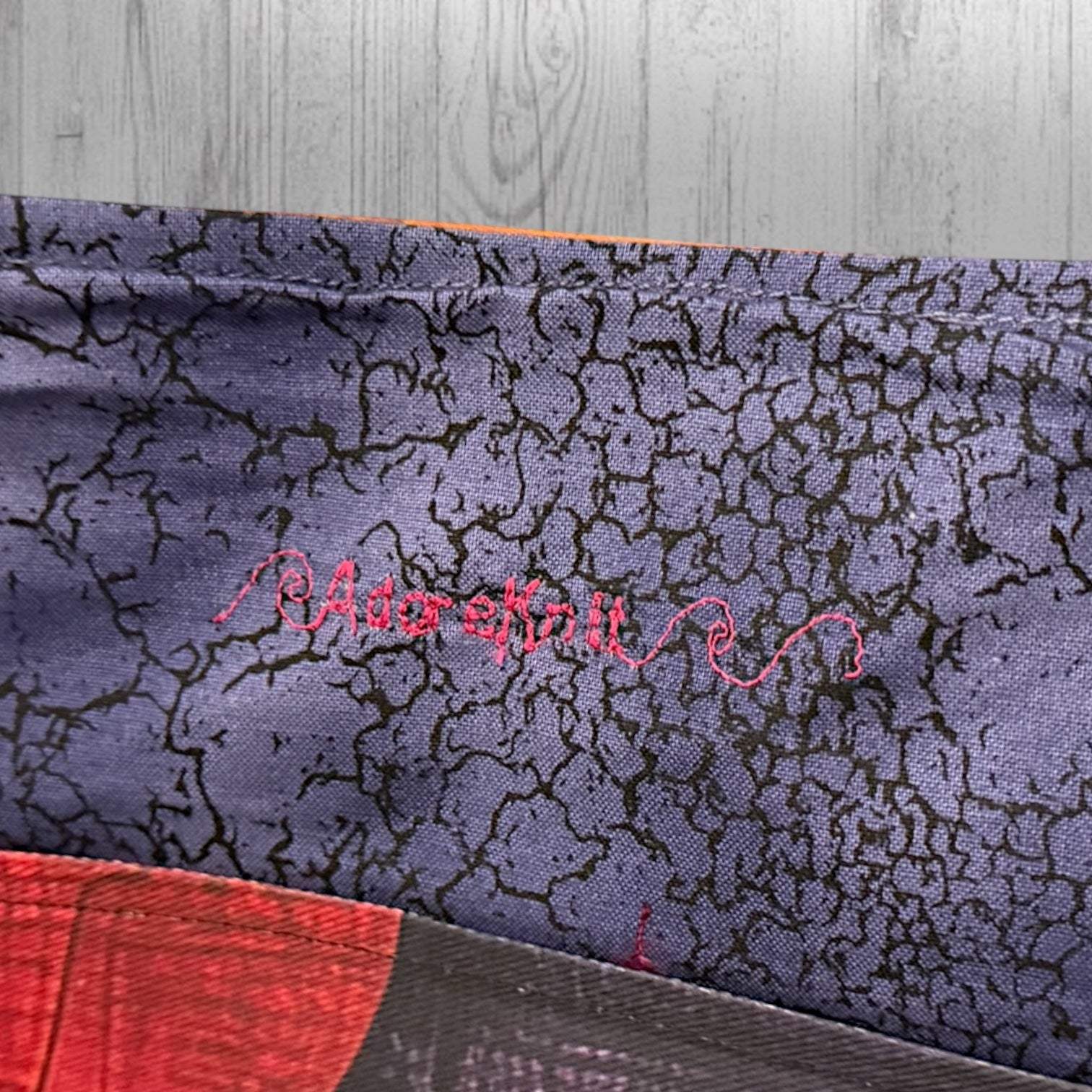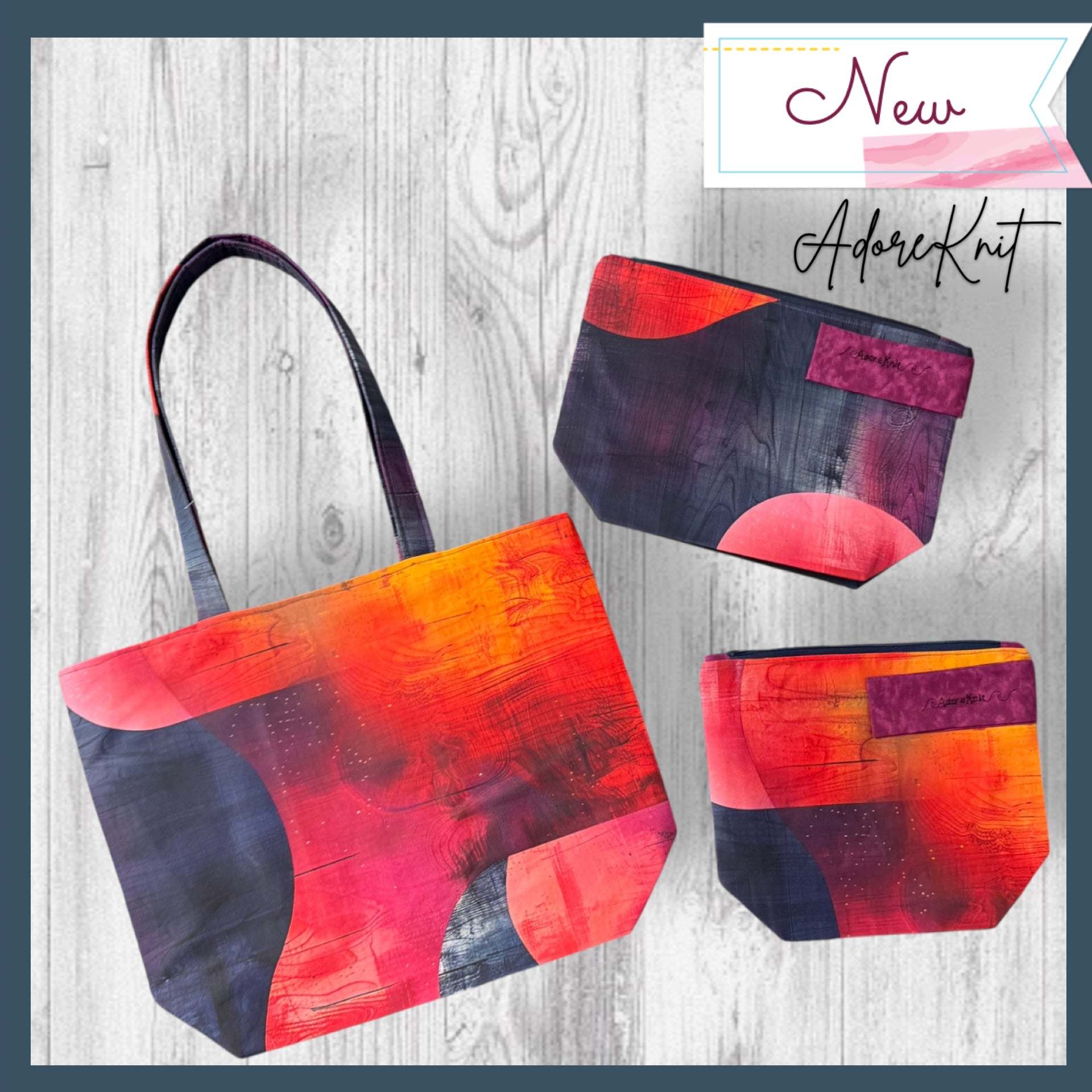 Both the Day-to-Day Bag and the Equator Bag feature a tonal purple wrist strap and a navy zipper for a clean, subtle finish. Each bag includes a removable zipper pull featuring three oblong mushrooms—whimsical and handy, as it doubles as a progress keeper in a pinch. The wrist strap adds both charm and function, with black embroidered “AdoreKnit” detailing. Interiors are fully lined in a peach and magenta swirl fabric for a cheerful pop of color every time you open your bag.