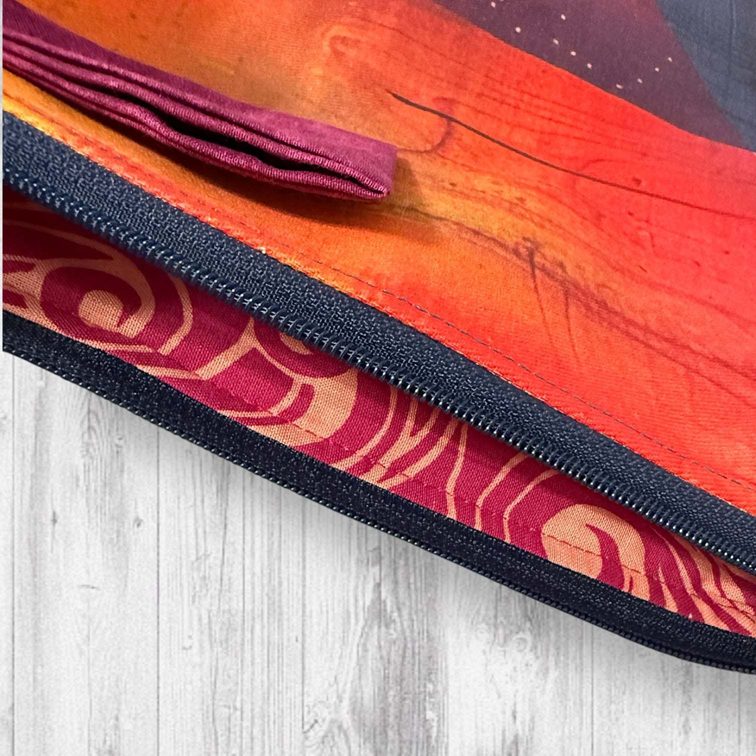 Everest Bag is our largest sized bag, made to a minimum of 13” high, 16” wide at the zippered top, with a rectangular bottom of 12” by 4”. The bag will comfortably fit six or even eight skein projects and is ideal for sweaters, larger shawl projects, and even blankets.