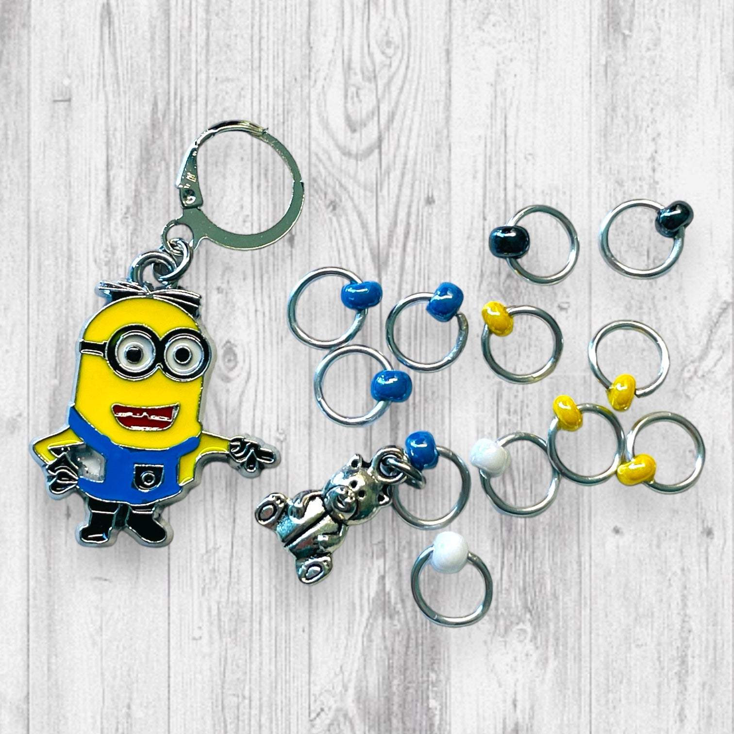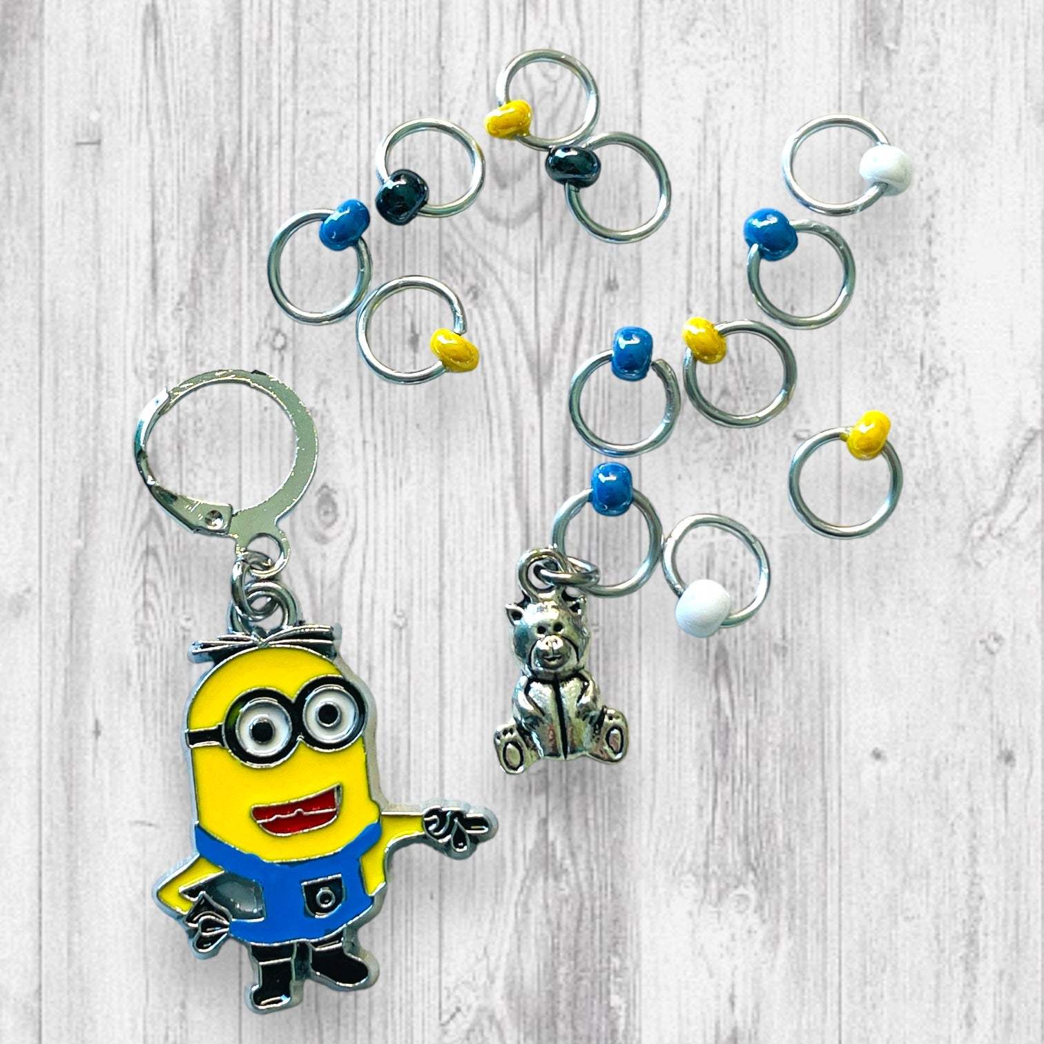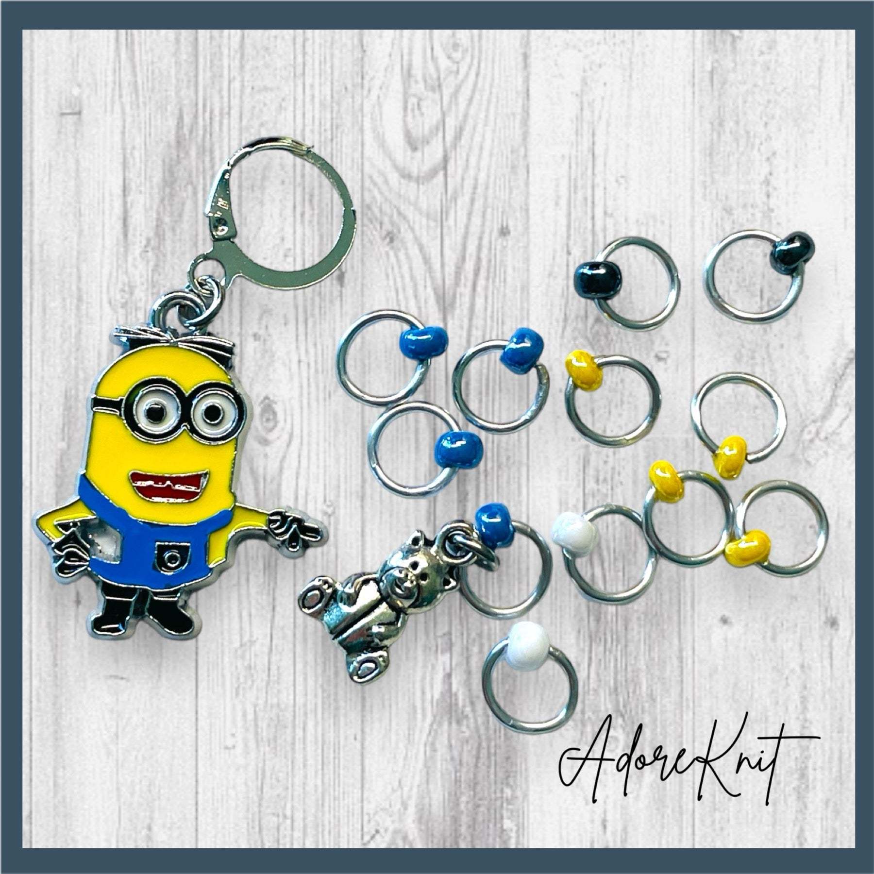 Teddy Bear Minion Progress and Stitch Markers. Inspired by the Minions of the beloved 2010 movie, Despicable Me. The prefect gift for a knitter! These stitch markers are great for a knitter or crocheter. Include in a swap package, teacher gift, or a little pick me up for the knitter in your life.