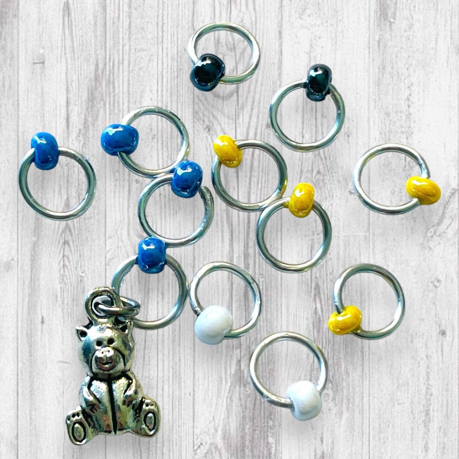 Stitch marker set: Silver metal alloy rings carry lustrous beads of minion matte yellow (4), overall blue (4), boot black (2) and eye white (2).
