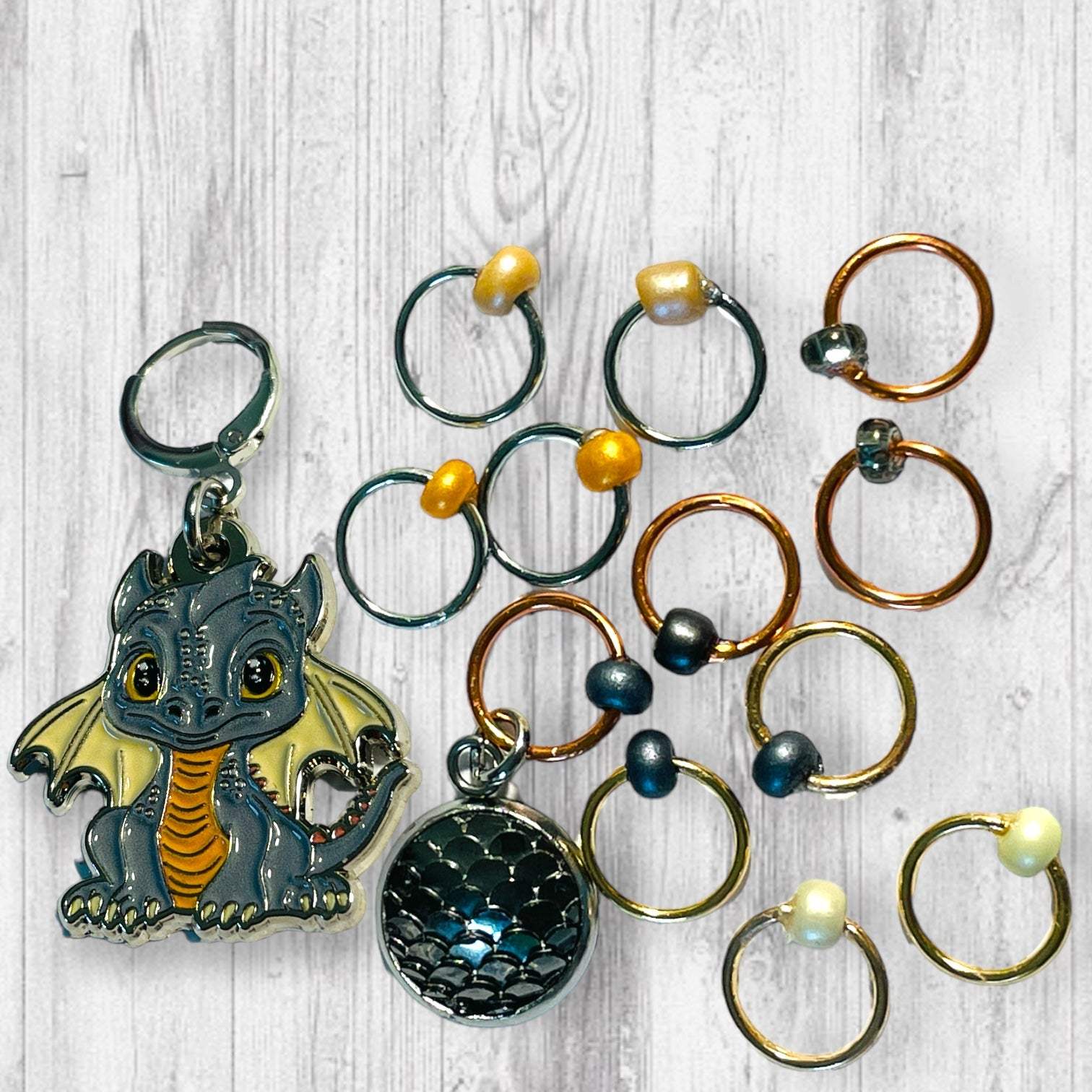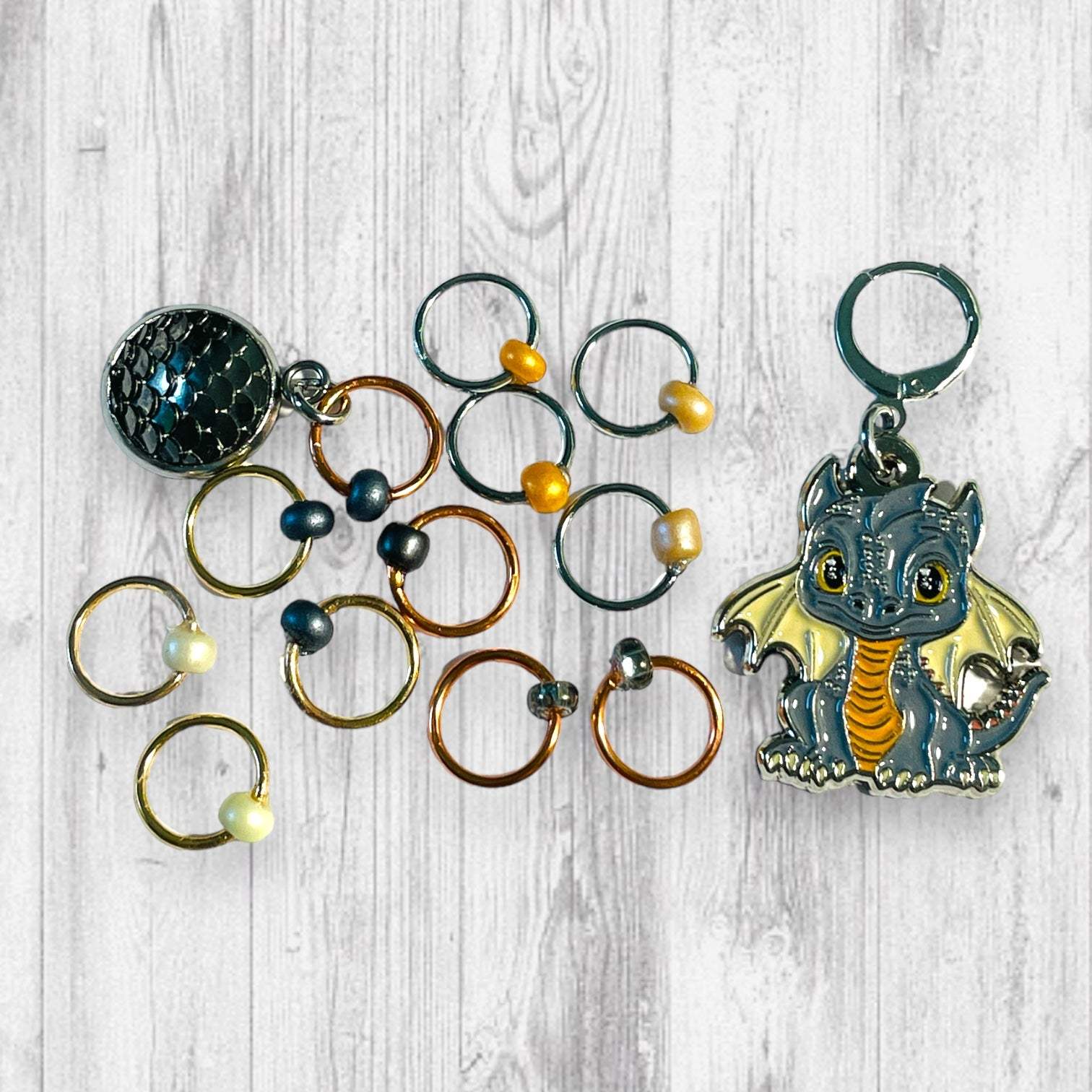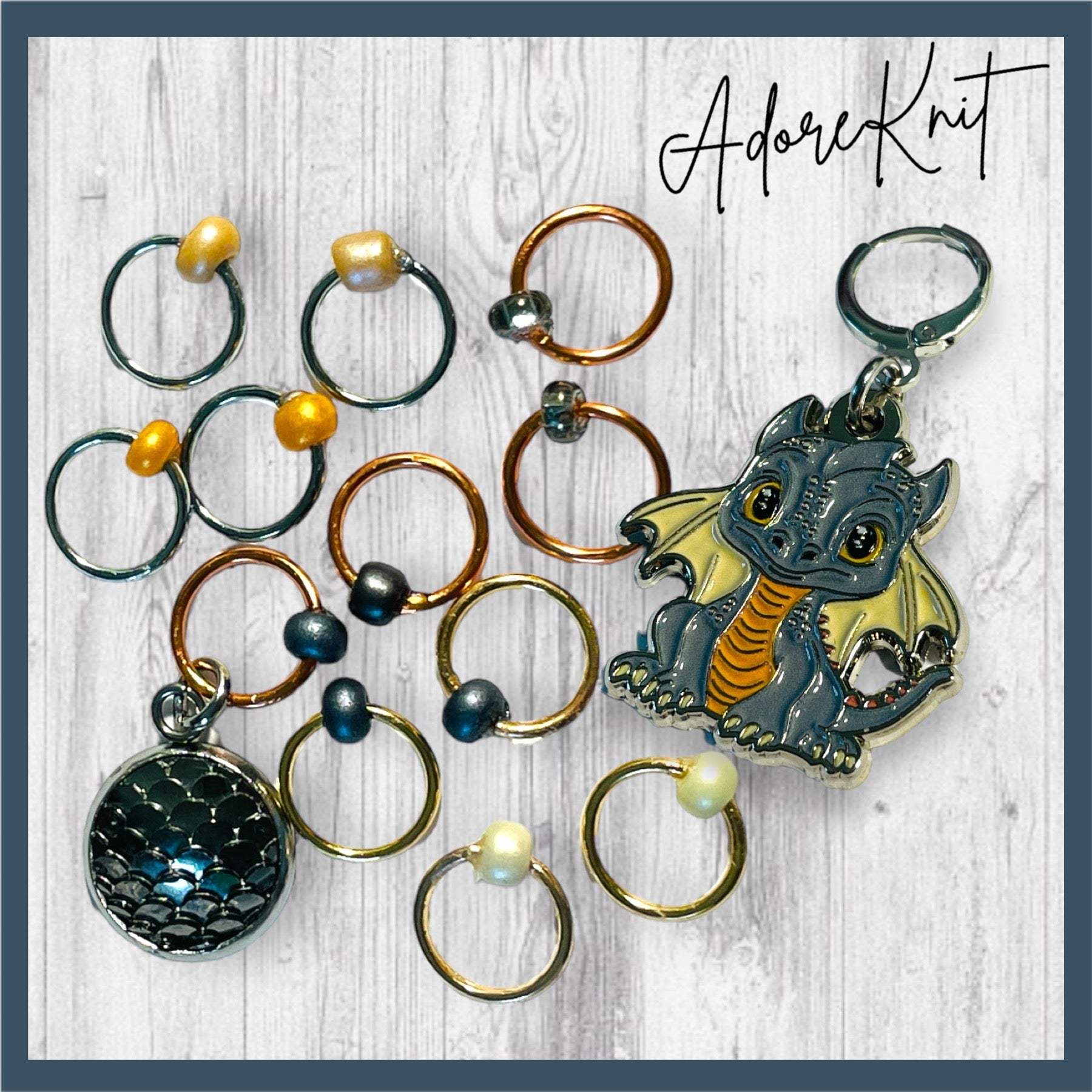 * A Set of 12 Stitch Markers that include an Black Dragon Scale beginning of the round (BOR) marker or