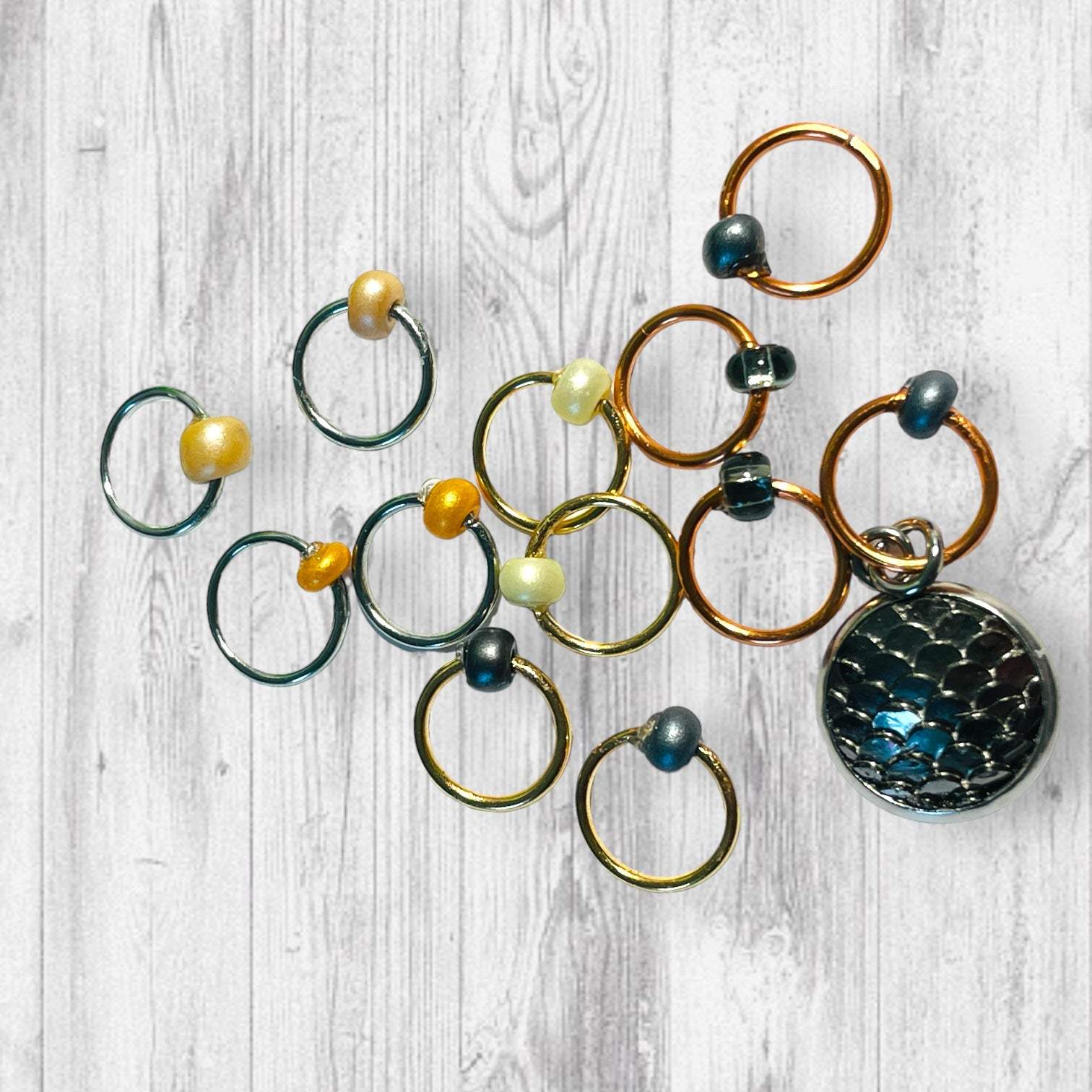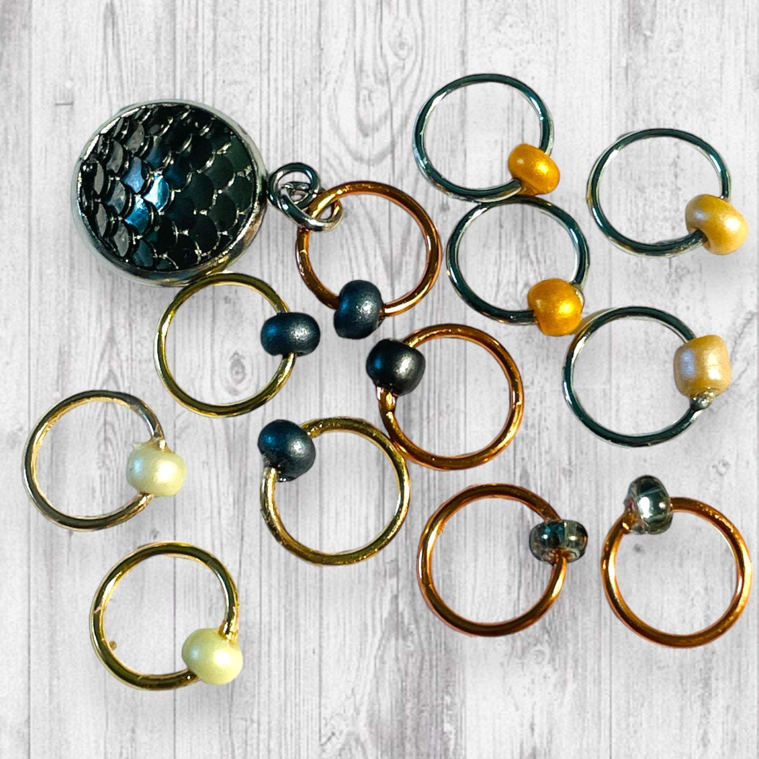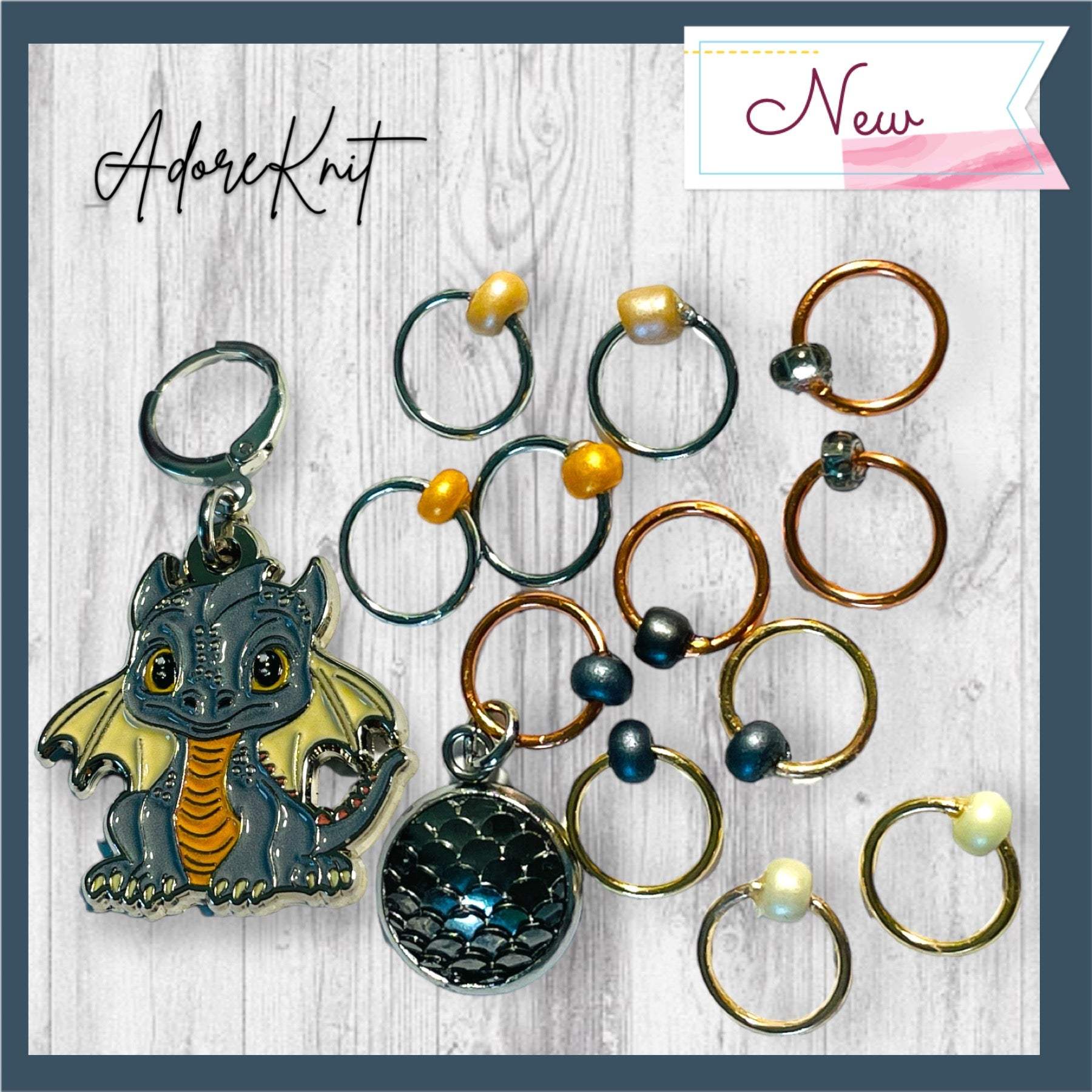 * A Set of 12 Stitch Markers that include an Black Dragon Scale beginning of the round (BOR) marker or