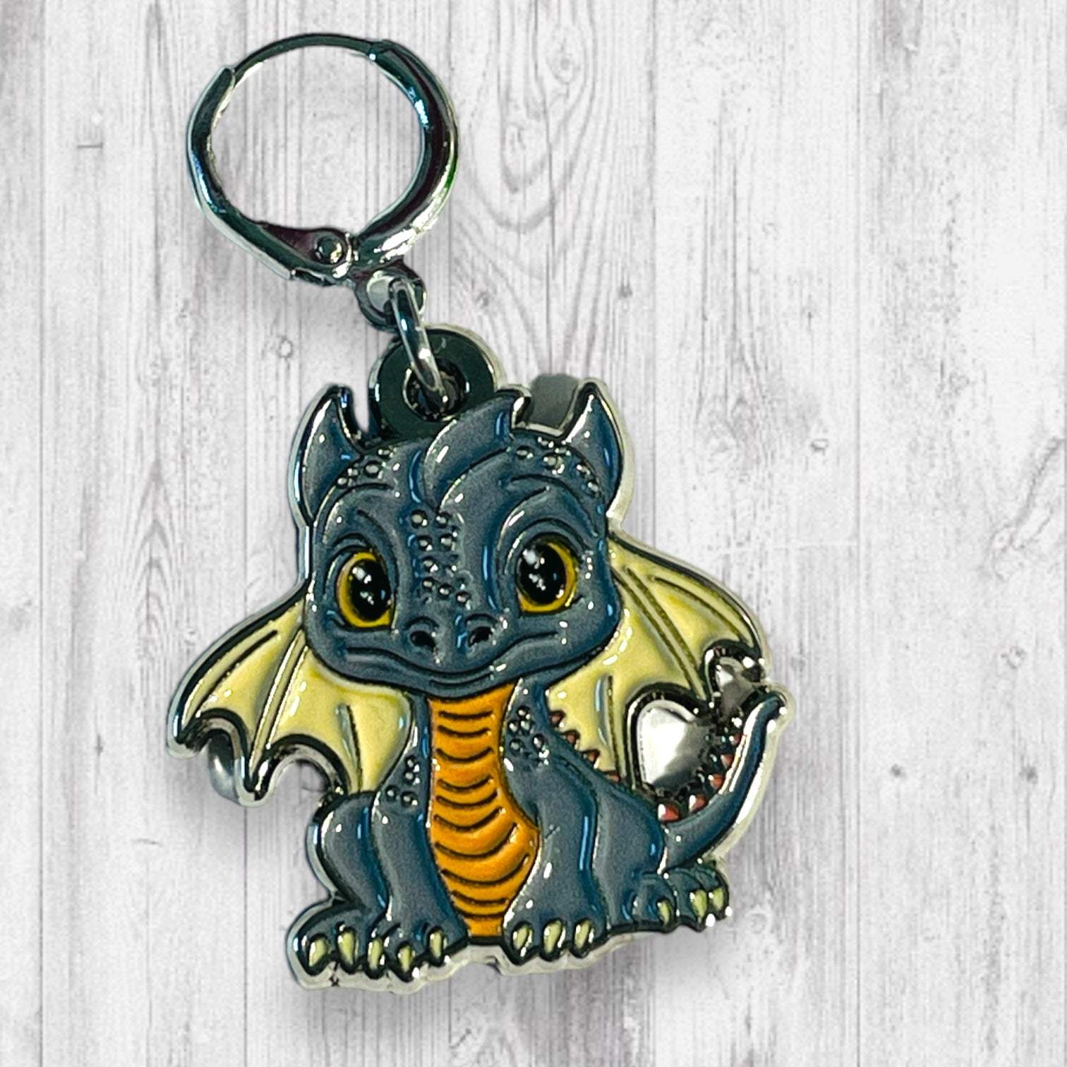 The Dragon and His Wrath Progress and Stitch Markers are part of our Summer of Dragons Collection. They are prefect gift for a knitter who loves dragons! These stitch markers are great for a knitter or crocheter. Include in a swap package, teacher gift, or a little pick me up for the knitter in your life. This is Cinder: the Gray Charmer, a calm and collected dragon