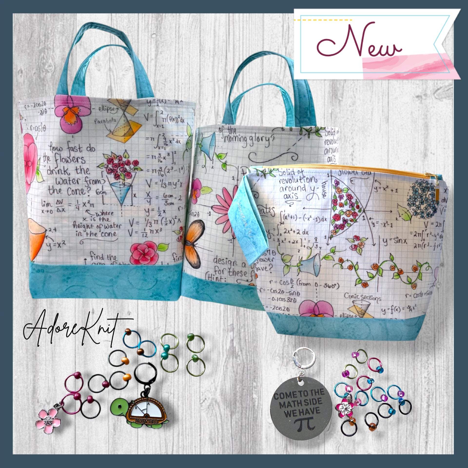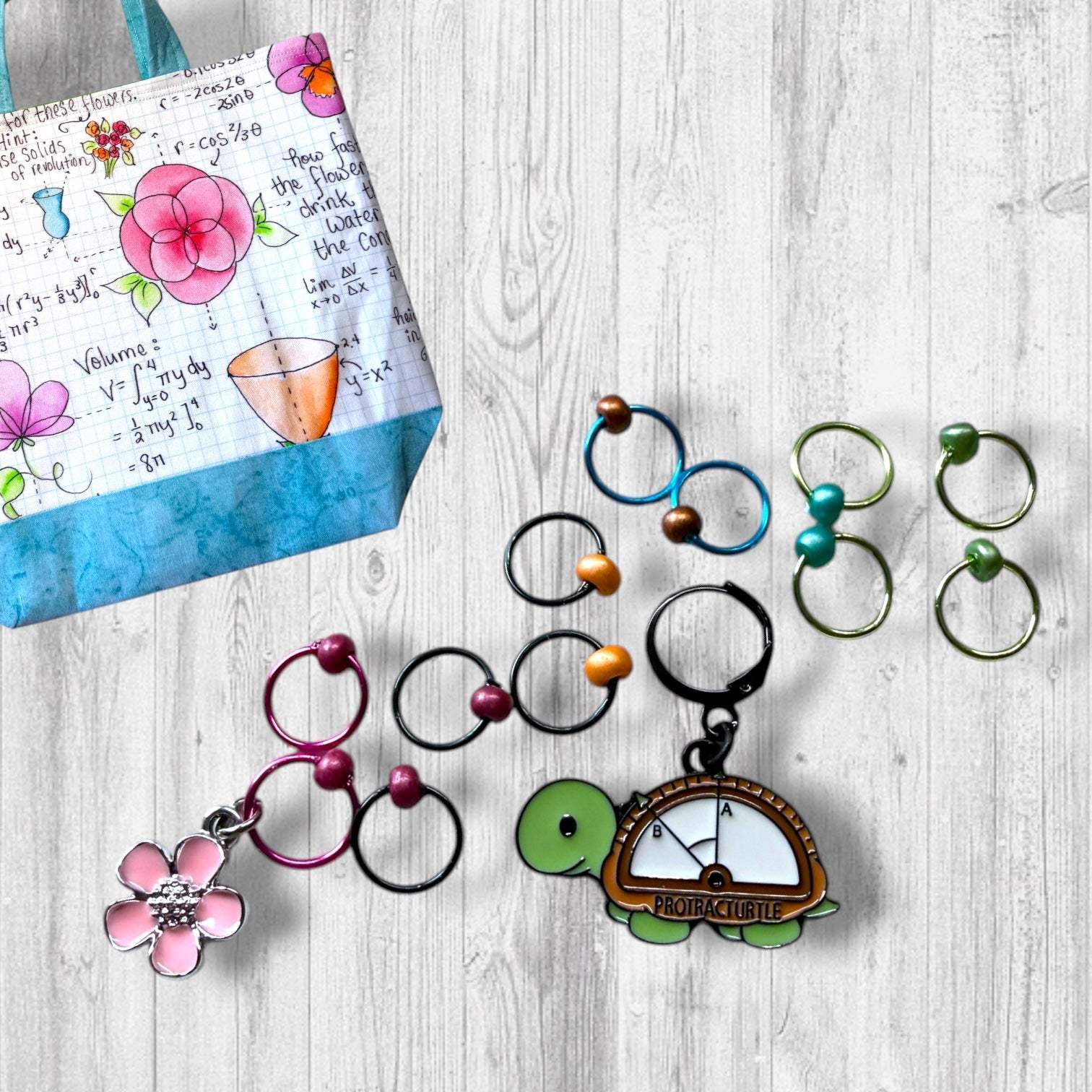 This set features a calculating and steady Protrac-Turtle paired with a lovely pink flower and markers in colors that perfectly compliment the project bag.