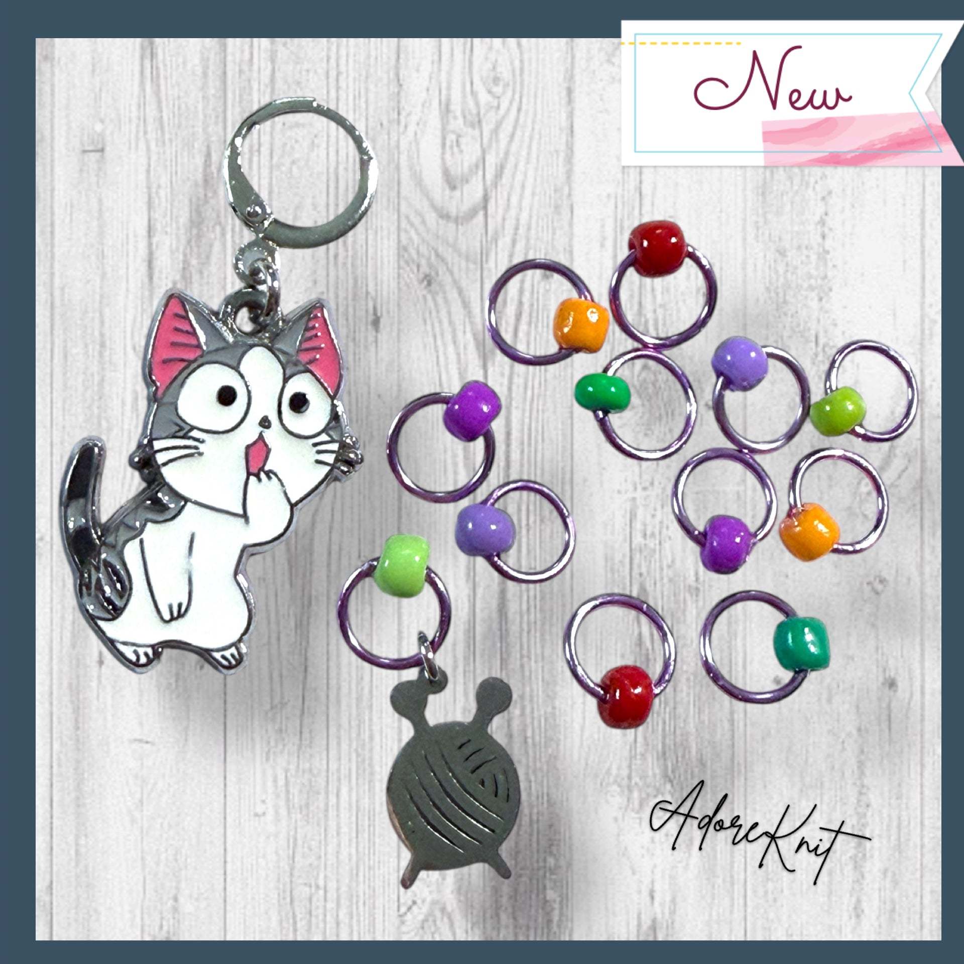 Tree Meowgicians Progress and Stitch Markers. Designed to match the Tree Meowgicians Project Bags. These brightly colored stitch markers are perfect for anyone who believes creativity should come with whiskers and whimsy.