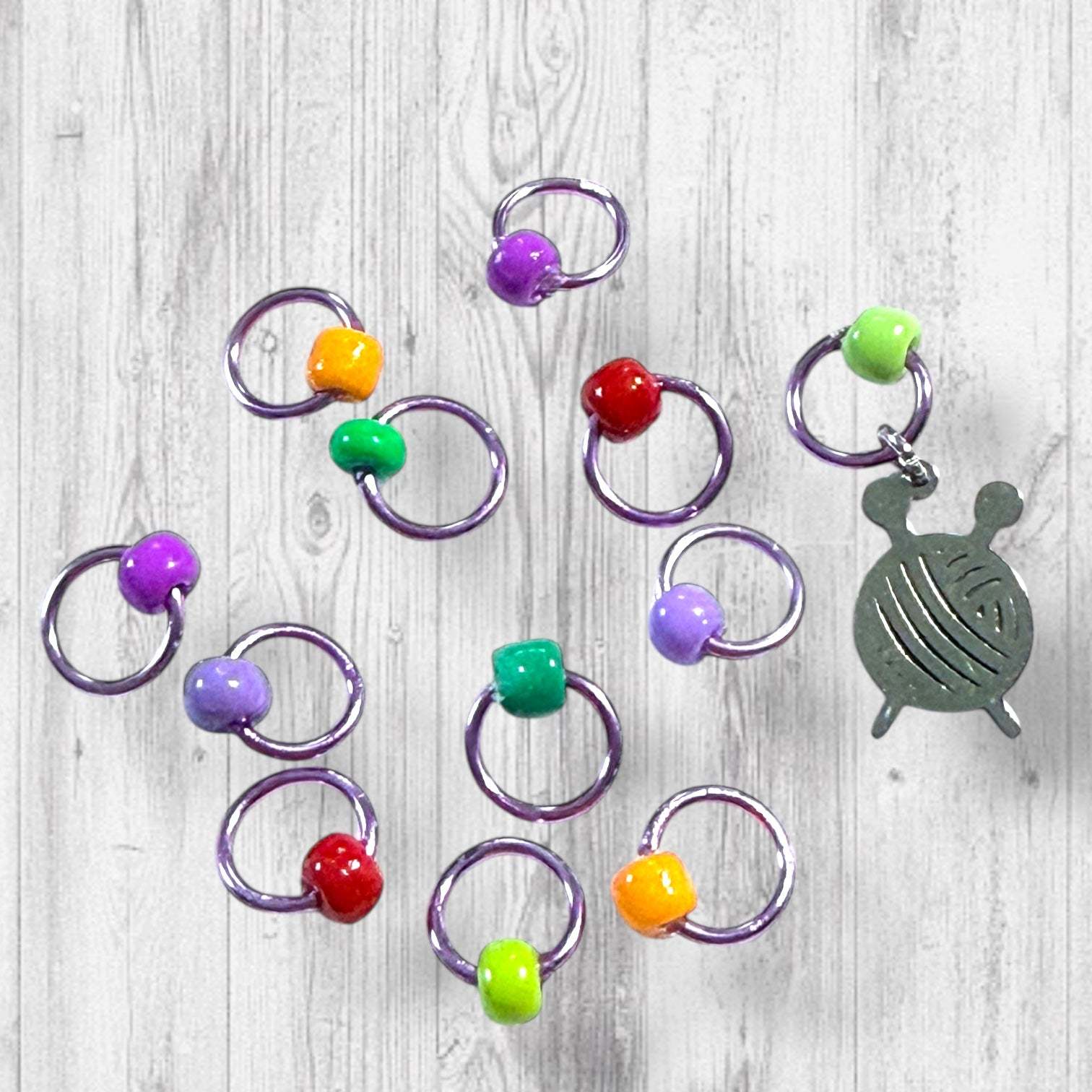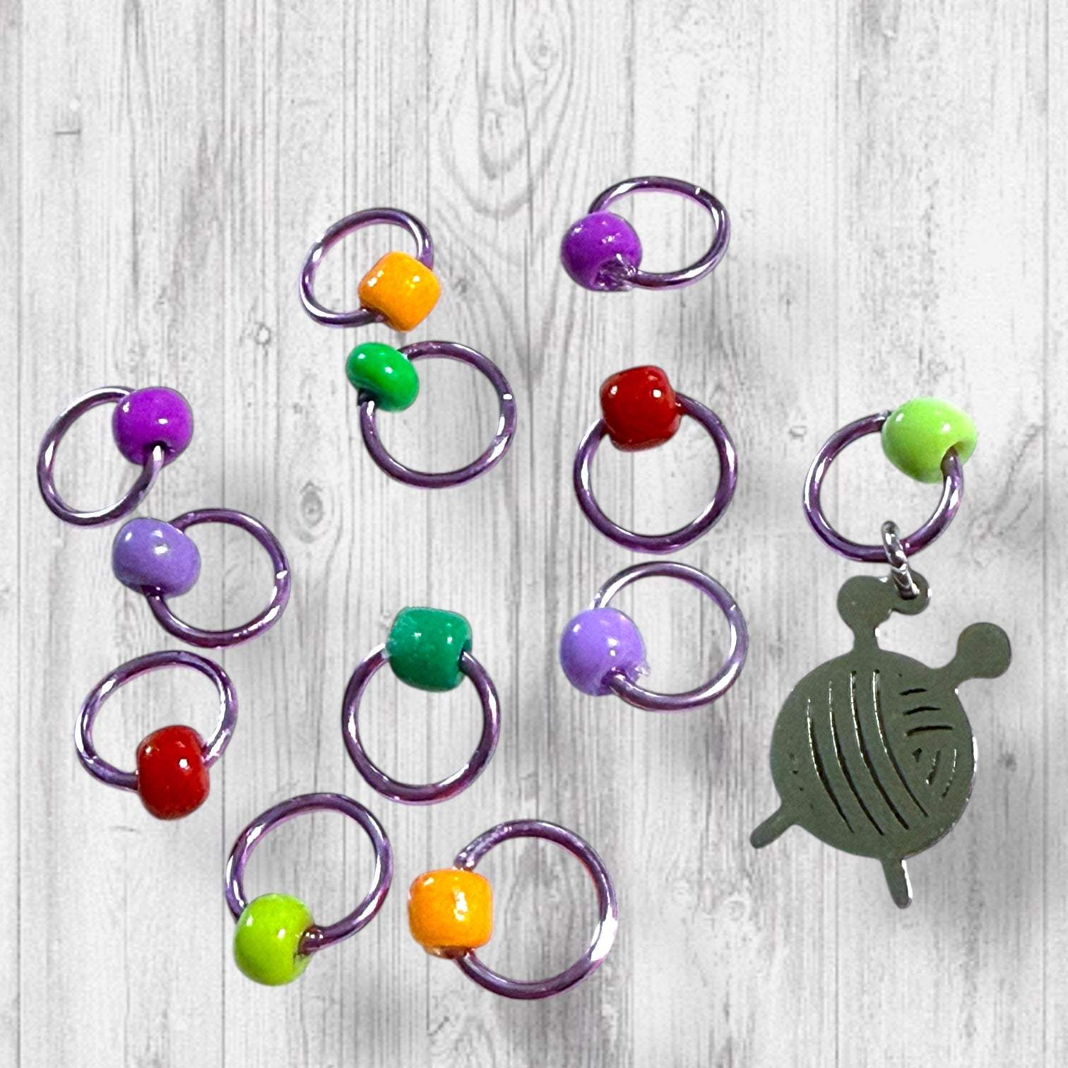 12 Stitch Marker Set: features shiny metal alloy lavender rings, each carrying shiny beads of brick red, grass green, bright green, peach, bright purple, and lavender.