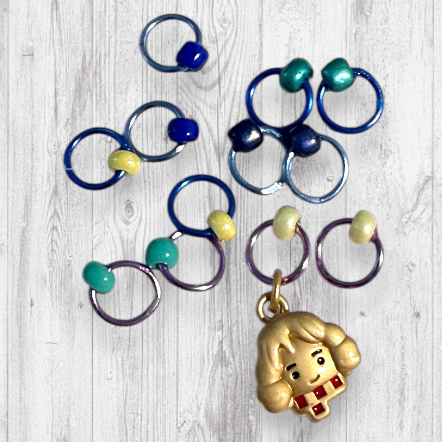 Set of 12 stitch markers: Navy, light blue, and lavender zinc alloy metal rings carry beads with saten or shiny finishes in teal, yellow, and navy.  The beginning of round marker is everyone's favorite young witch.