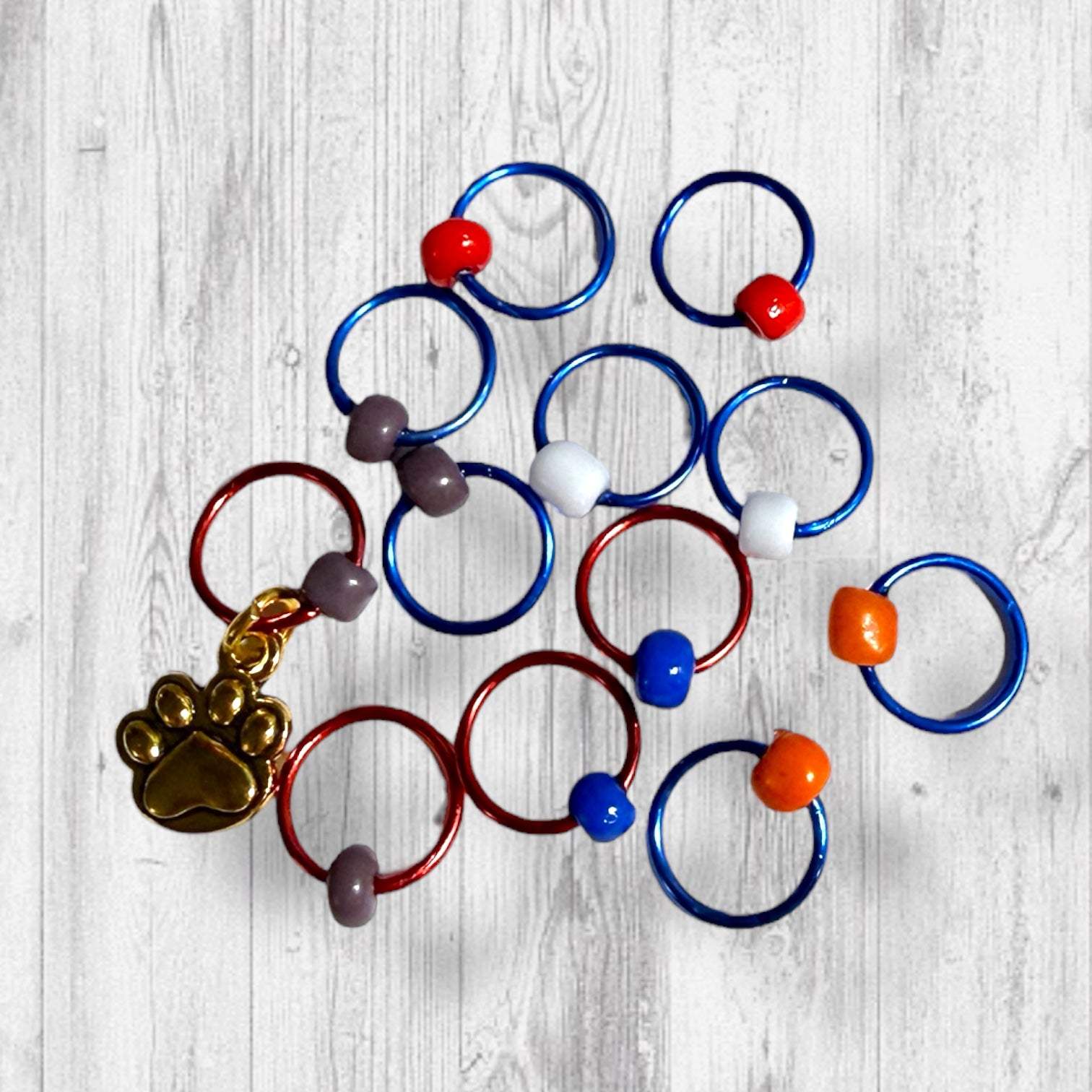A playful set of 12 stitch markers with metal alloy rings in bright blue and red, finished with shiny beads in tabby cat gray, white cat, orange cat, bright blue, and red for a cheerful pop of color.