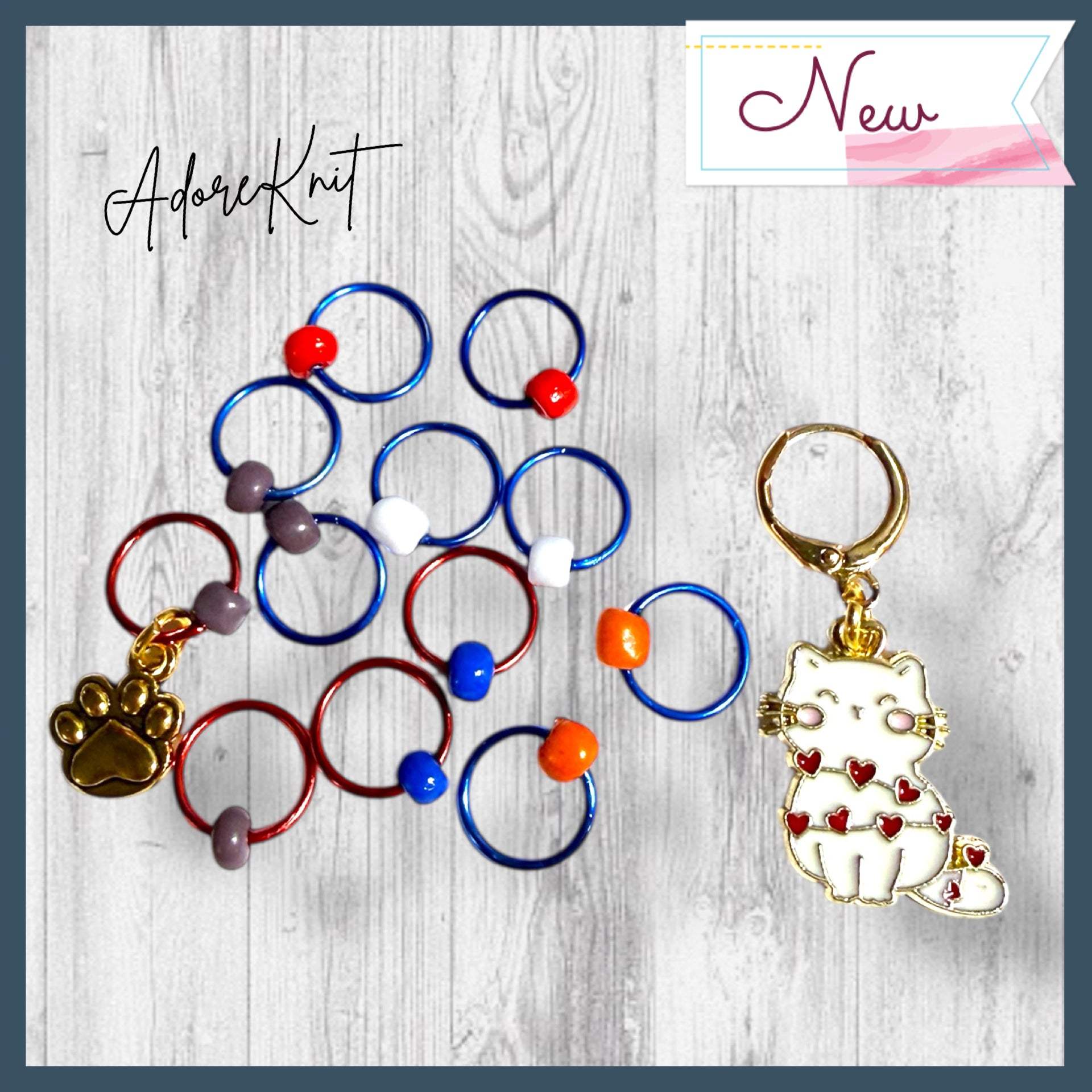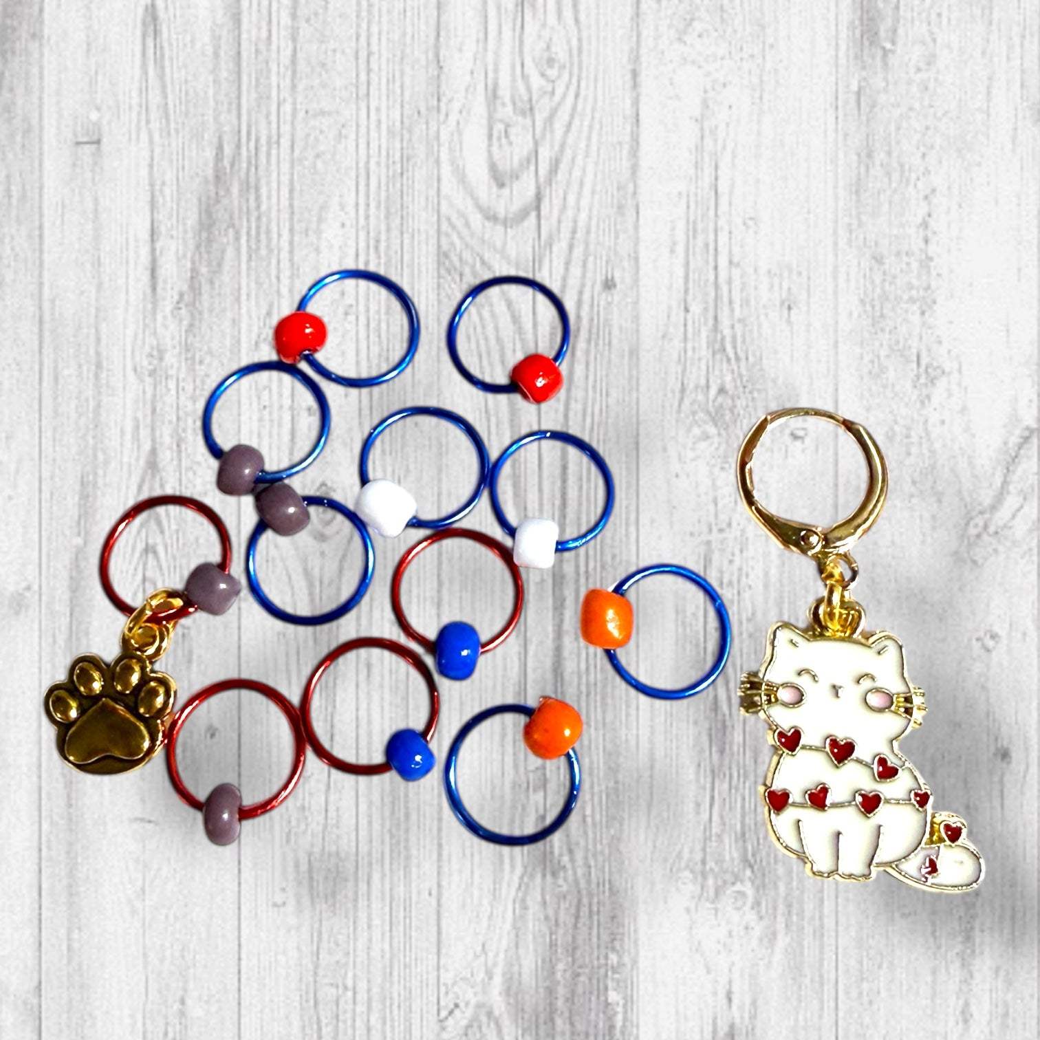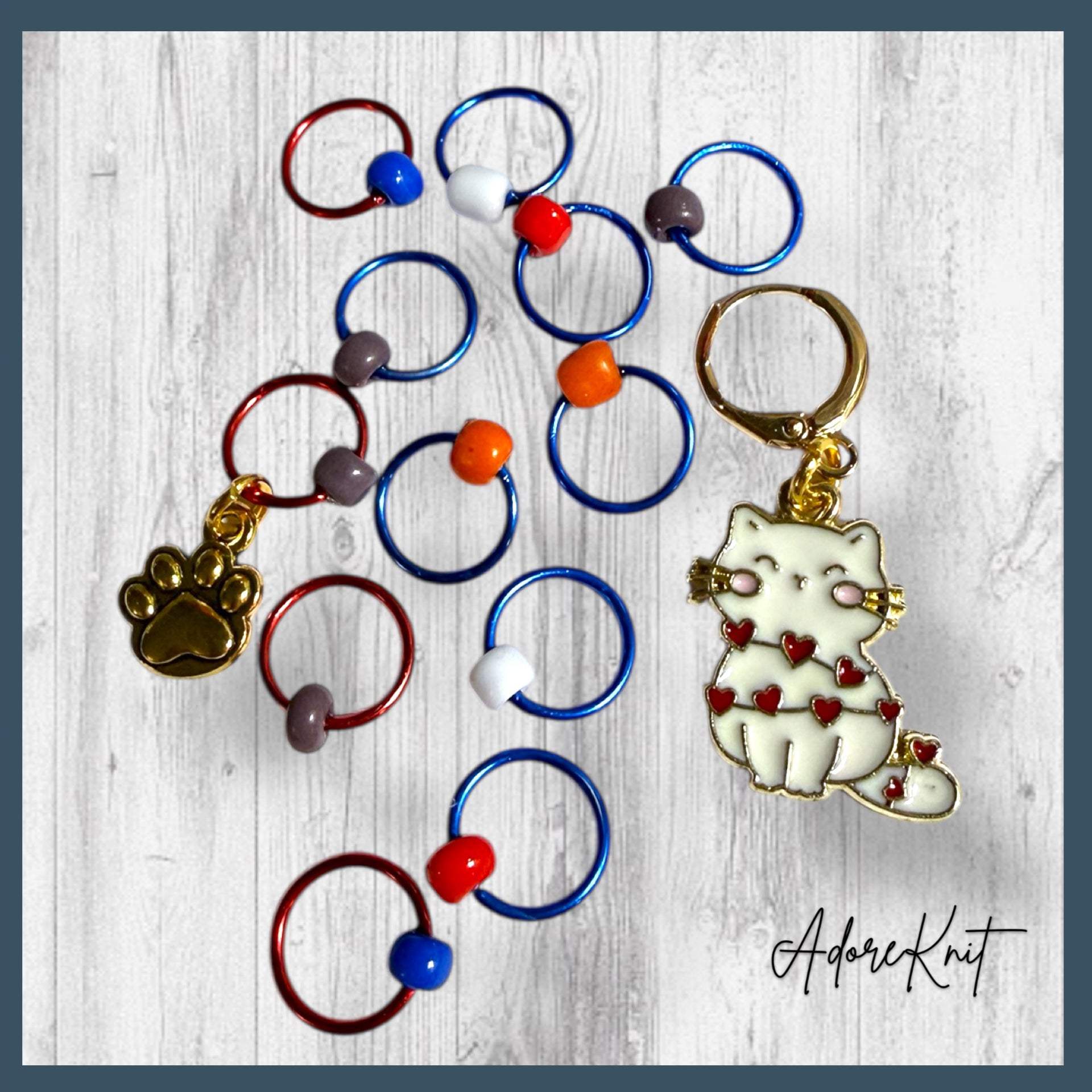- A combo of the Heart Wrapped White Cat Progress Marker/Keeper and the Set of 12 Stitch Markers (Including a paw print marker!)